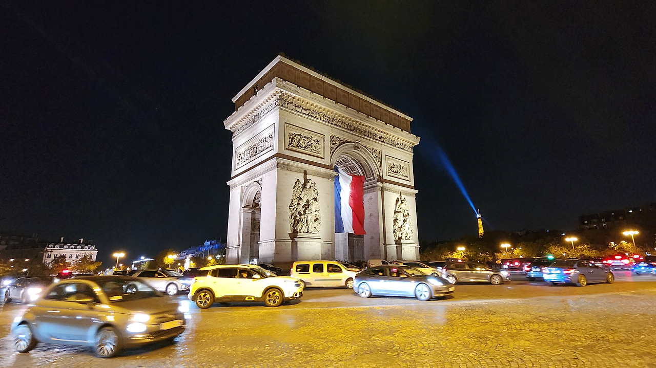 첫날 에펠탑의 야경을 보고 싶었지만 시차 부적응으로 5시부터 쏟아지는 잠을 이기지 못했고 오늘은 꼭 보겠다고 다짐하며 나흘째 되는 날 야경을 보러 갔다. 쏟아지는 잠을 꾹꾹 참으며 개선문을 보러 간 뒤 에펠탑을 보기로 했다. 계획하고 간 것은 아니었는데 11월 11일은 프랑스 국경일(1차 세계대전 휴전기념일)이라고 해서 개선문 한가운데 국기가 달려있었다. 완벽하게 연출된 듯 멋지게 펄럭이는 삼색기가 개선문의 아름다움을 더해주는 것 같았다.