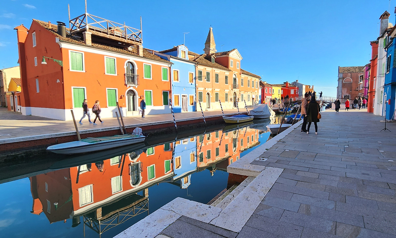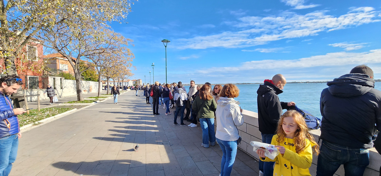 부라노섬을 가는 수상버스를 타려고 정류장 쪽으로 갔더니 정류장이 보이지도 않을 만큼 대기 줄이 너무 길었다. 줄 서서 기다리는 거 기피하는 스타일인데 이번에는 선택의 여지가 없었다. 보트로 호객하는 사람들도 있었고 새치기하려고 시도하는 사람도 있었다. 가장 지루한 시간이었지만 음악 들으며 바다구경, 사람 구경하다 보니 한 시간 반이 흘렀다. 한 시간 반 만에 겨우 수상버스를 타고 아이유가 뮤직비디오를 찍었다는 동화 같은 부라노섬에 도착했다.