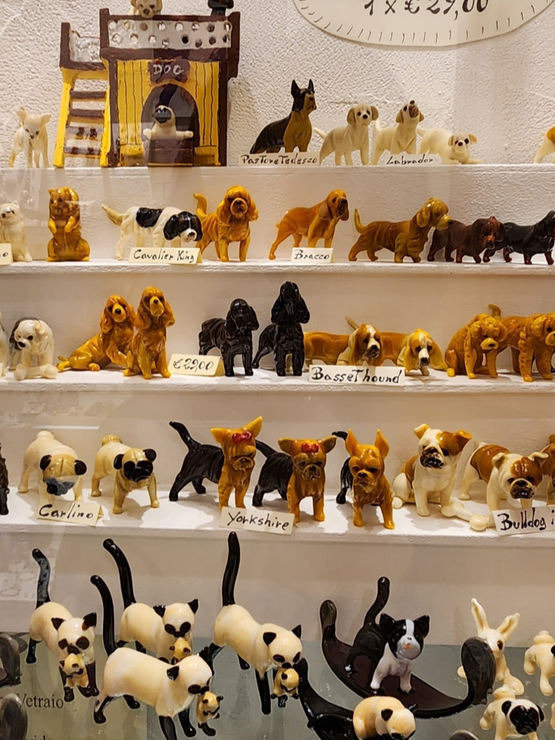 나는 무라노섬을 간 뒤 부라노섬으로 갔는데 도착했을 때만 해도 사람이 그다지 많지 않아 둘러보기 좋았다. 그러다 10시가 넘으니 점점 사람이 많아지면서 복잡해지기 시작했다. 보통 부라노섬이 유명하기 때문에 무라노섬은 시간이 없으면 생략해도 좋다는 후기를 많이 볼 수 있었다. 그래서 그런지 큰 기대 없이 갔던 곳이었지만 본섬과 부라노섬과는 또 다른 분위기를 가진 곳이라 기분 좋은 시간을 보낼 수 있었다. 무라노 섬은 유리공예가 유명해서 그런지 공예 상점이 굉장히 많았고 액세서리부터 인테리어 소품까지 다양했다. 사람 심리가 필요 없어도 유명하다 하면 괜히 사고 싶어 지듯 나도 우리 집 강아지를 닮은 스탠다드 푸들을 사고 싶어 이곳저곳 찾아봤지만 찾지 못해 구경만 하다 나왔다.