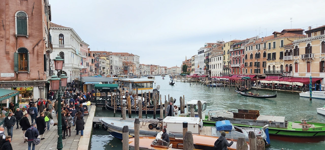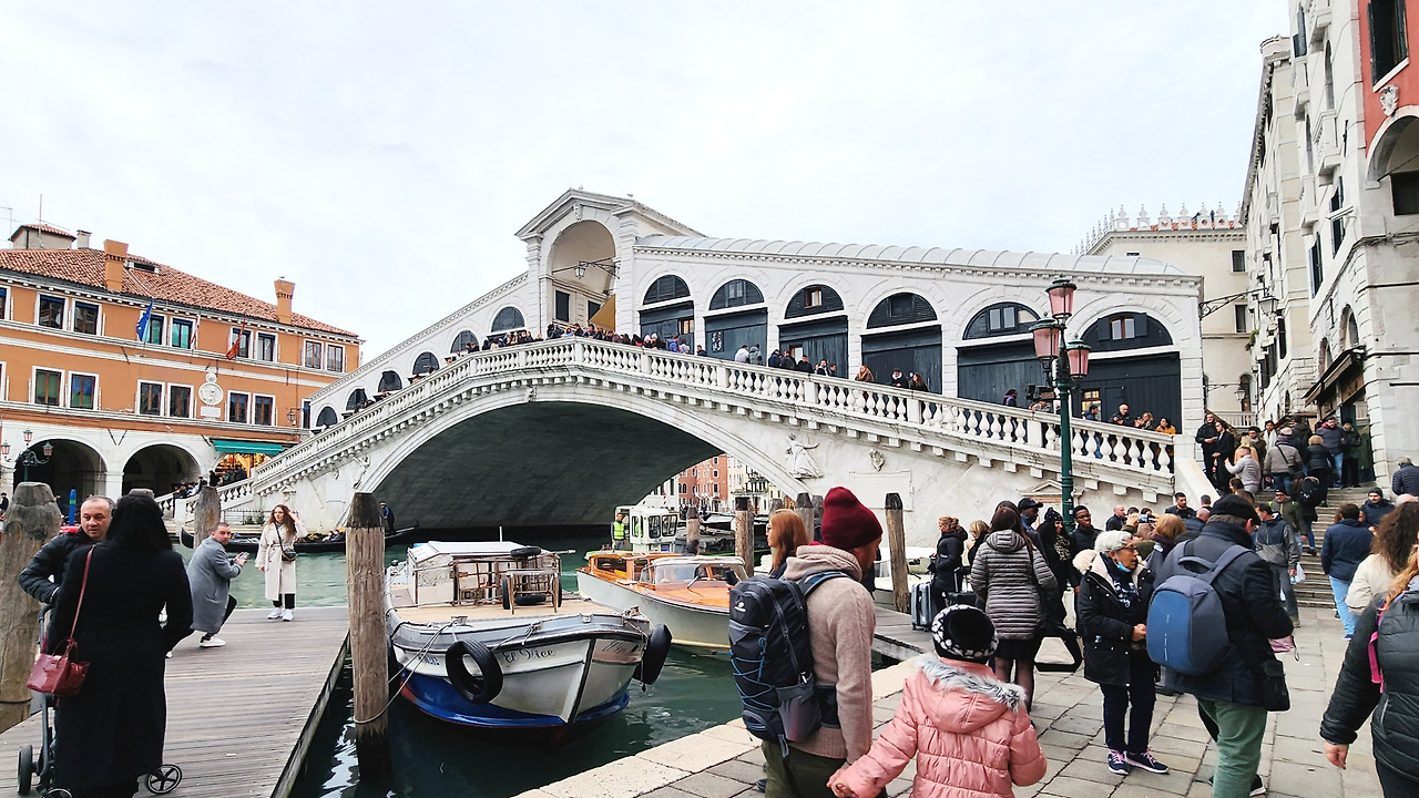 메스트레역 거리는 그렇게 한산하더니 본섬으로 들어가는 산타루치아 역에는 관광객들로 가득했다. 산타루치아 역에서 또다시 10분 정도 수상버스를 타고 들어간 뒤 인파들 사이에 반 강제로 떠밀려 간 곳이 리알토 다리였다. 리알토 다리가 카날 그란데를 연결하는 네 개의 다리 중에서 가장 오래되어 상징적인 다리라고 알려진 만큼 기념 촬영을 하기 위해 기다리는 사람들로 꽉 차있었다. 자연스럽게 위에서 사람들이 사진을 찍고 내려올 때까지 아래에서 기다려야 했다. 한 칸 올라가서 기다리고 한 칸 올라가서 기다리고 할 때쯤 갑자기 사람들이 환호성을 지르기 시작했다. 무슨 일인가 싶어 열심히 두리번거리고 소리의 근원지를 찾아보니 한 곳을 향해 많은 사람들이 사진을 찍고 있었다. 그건 한 남자가 여자에게 무릎을 꿇고 프러포즈를 하고 있는 것이었다. 아름다운 이곳에서 새로운 인생의 한편이 시작되는 커플을 향해 자기 일처럼 환호하고 축하해 주는 이 모든 모습이 마치 영화의 한 장면 같았다.