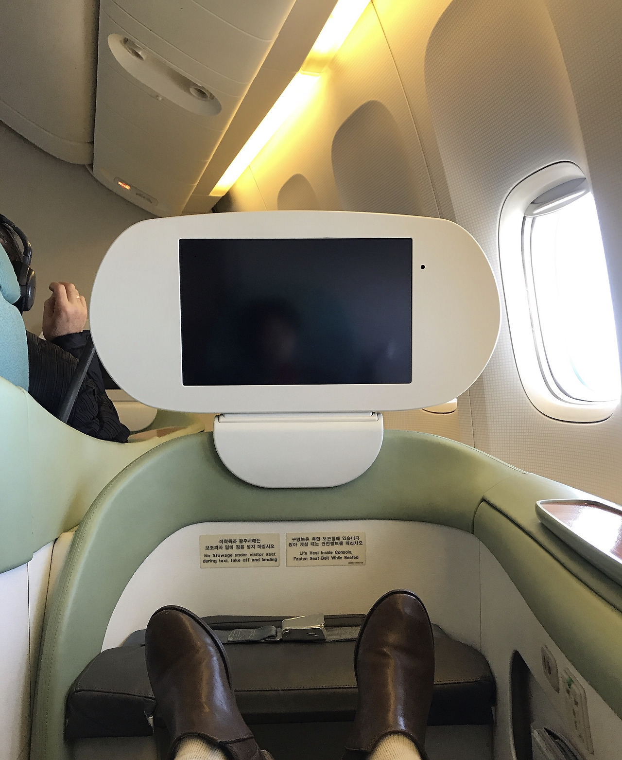 프레스티지석 한 개의 좌석이 차지하는 창문은 총 다섯 개였다. 이코노미석이 한 개 내지는 0.8개의 창문을 세명 내지 네 명이 나누어 차지할 수 있다는 사실을 상기한다면 프리스티지 손님이 기내에서 차지하는 공간은 실로 어마어마한 것이다. 상식적으로 좌석이 180도로 젖혀져 성인이 완전히 누울 자리를 마련하려면 창문 다섯 개는 거뜬히 필요하다. 좌석의 폭은 넓었고 주어진 배게의 쿠션감은 적당하고 뽀송해 얼굴에 닿는 느낌이 포근하기까지 했다. 이코노미 석에도 주어지는 독서 등 외에도 자유자재로 움직이는 개인용 독서등이 있어 어둑한 기내에서 침침하게 독서를 하지 않아도 되었고 상반신 하반신 허리 부분이 분절적으로 조절 가능해 자신에게 맞는 최적의 자세를 유지할 수 있게 해 주었다. 말하자면 지극히 인간적인 상태에서의 비행이었다. 다리를 제대로 펼 수 없는(물론 나는 편다) 다닥다닥 붙은 이코노미석에서 열 시간은 앉은 자세로 가는 것이 비인간적인 것이라는 사실을 잊고 살았다. 아니 알지 못했다.