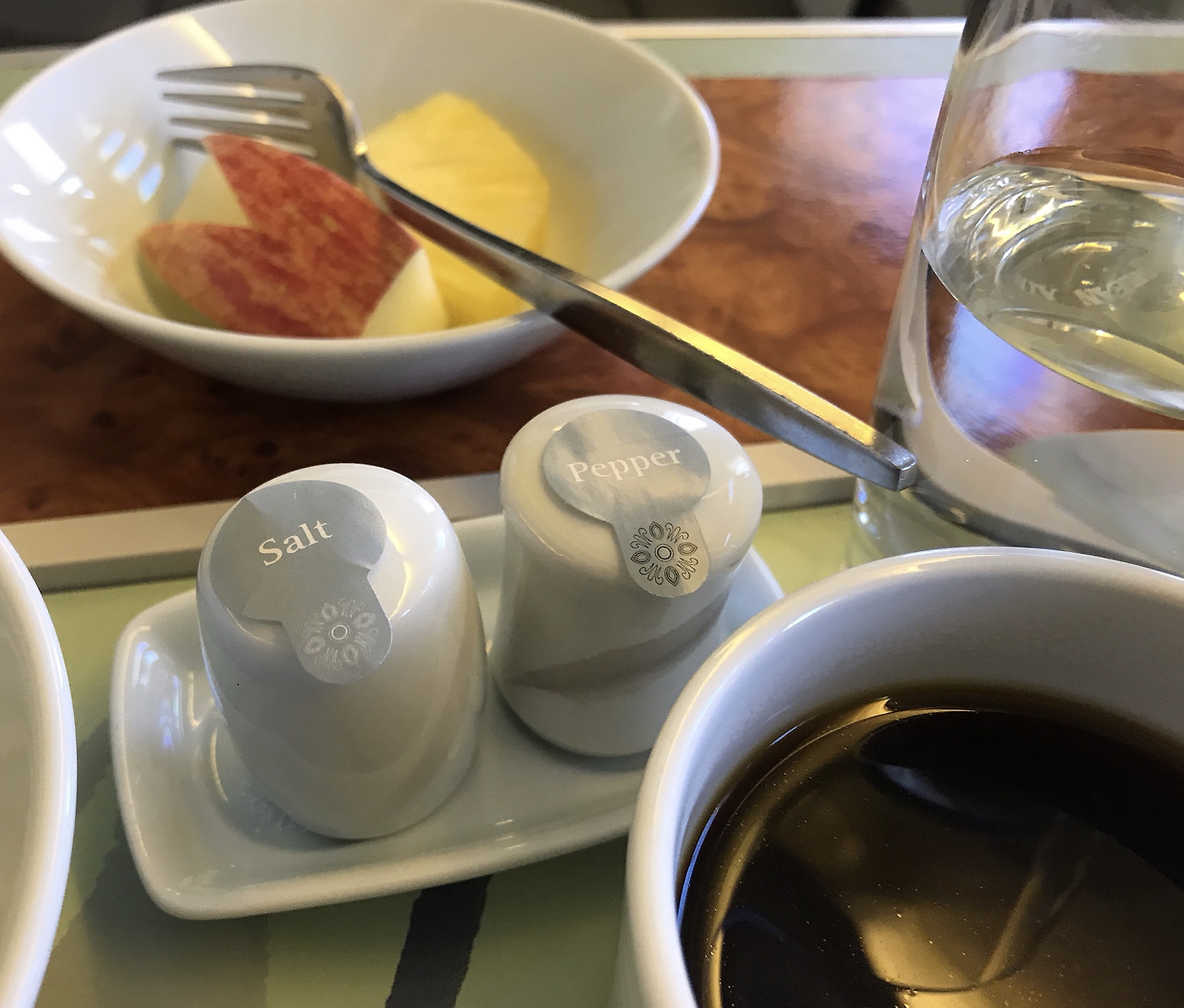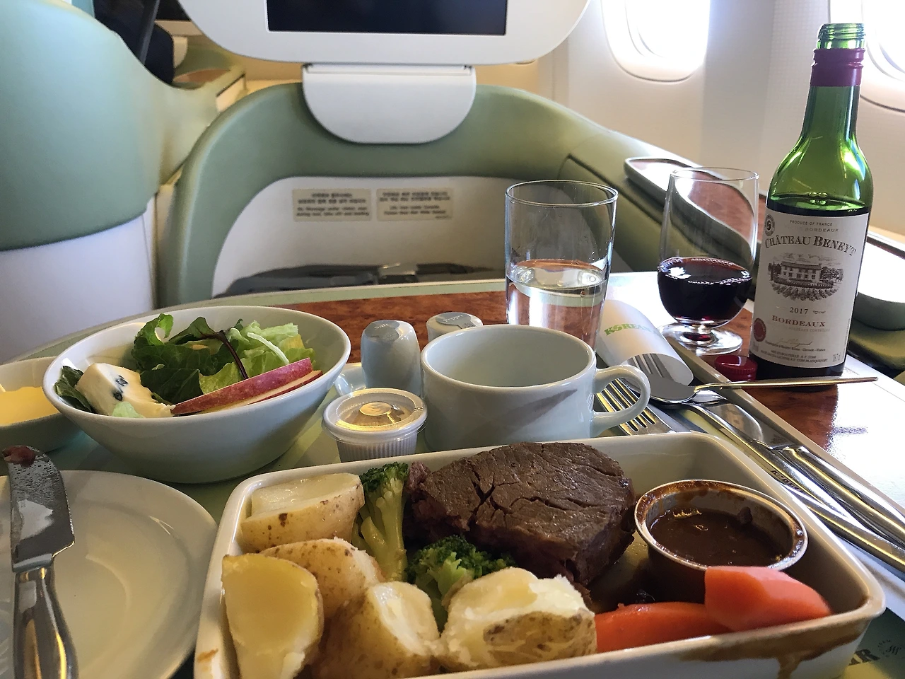 식기류는 일회 용기가 아니었고 후추와 소금과 같은 것도 앙증맞은 세라믹 용기에 담겨 나왔다. 커트러리는 이코노미석과 다르지 않았는데 이상하게 짤그랑 짤그랑 포크와 나이프가 부딪히는 소리가 기내를 채웠다. 낯선 광경이라 생각했는데 가만 보니 이는 식사로 스테이크가 제공되었기 때문이었다. 기본 미디엄으로 구워진 소고기를 썰기 위해 그야말로 칼질이 필요했고 불가피하게 ‘리치(rich)’한 소음이 발생됐다. 이코노미석 손님에게 제공되는 식사는 대게 포크 하나로 거뜬하다.