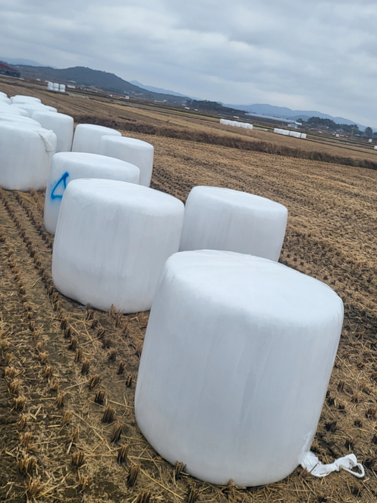 벼농사를 마치고 볏짚을 진공 포장한 볏짚 곤포사일리지이다.