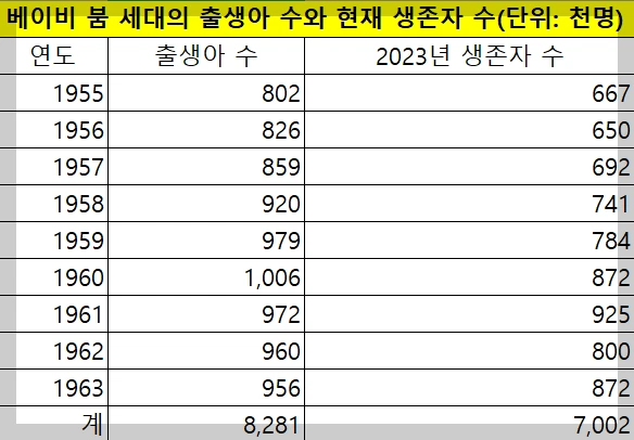 우리나라의 베이비 붐 세대는 한국전쟁(1950~1953) 직후인 1955년 생부터 산아제한이 본격시행직전인 1963년 생까지이다. 태어날 때는 828.1만 명으로 총인구의 30.4%였으나, 2023년 현재 700.2만 명이 생존해 있으며 총인구의 13.6%를 차지하고 있다. 베이붐 세대의 막내인 1963년생이 올해 60세가 되면서 정년으로 원래 직장에서 모두 퇴직하였다. 한국은 고용상 연령차별금지 및 고령자고용촉진법에 정년이 60세 이상으로 되어 있으나, 기업들은 거의 대부분 정년을 60세로 운영하고 있다.