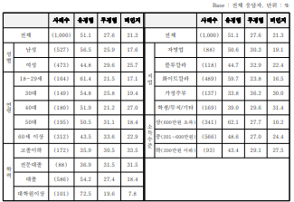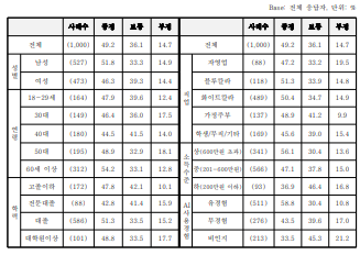 □ (해석) 60세 이상은 자신들의 사용대상이 되는 사회복지서비스나 보건의료서비스 분야에 AI가 크게 활용될 가능성에 기대를 걸고 있고, 소득이 높을수록 비용보다는 활용측면에 더 큰 비중을 두고 기대를 갖기 때문인 것으로 보인다. AI 유경험자나 소득 수준이 높을수록 지적업무 대체에 대해 긍정적 비중이 높았다. AI를 더 잘 알고 있는 사람들이 AI에 의한 지적업무 대체에 대해서도 보다 더 긍정적인 것으로 보인다.
