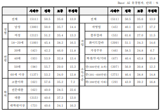□ (해석) 대화형 AI를 더 많이 쓰는 남성이나 학력 수준이 높은 계층일수록 AI 답변의 공정성을 낮게 평가하고 있는 것으로 보인다. 또한, 글쓰기 등 업무연관성이 높은 화이트칼라나 학력 수준이 높을수록 AI 답변의 공정을 낮게 평가한 것으로 보인다. 다만, 공정성이 전체 응답자의 45.6% 수준으로 낮은 것은 미국 주도로 개발된 대화형 AI의 미국 중심 답변 편향 우려와 언론에 의한 AI 답변의 공정성 우려 보도 등의 영향을 받은 것으로 보인다.