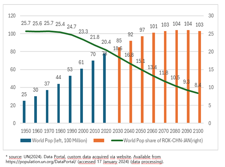 한중일 인구는 저출생 심화로 세계인구 중에서 차지하는 비중이 급속히 감소하고 있다. 1950년부터 1985년까지 25% 수준을 유지하였으나, 1986년부터 2022년까지 20% 수준으로 낮아졌으며, UN은 2023년부터 2050년까지는 15~20% 수준으로 낮아질 것으로 전망하고 있다. 더욱이 현 저출생의 추세가 유지될 경우 2100년에는 8.4%로 낮아져 인구감소 위기 시기에 이르게 될 것이다. 3국 모두 인구감소가 시작되었고, 그 폭 또한 커지고 있기 때문에 총인구도 가파르게 감소하기 시작할 것이다. 인구감소로 인해 각 국가 자체적으로도 축소지향으로 변함에 따른 고통이 수반되겠지만, 인구학적인 측면에서 한중일 3국의 글로벌 위상도 매우 낮아질 것으로 전망된다. 글로벌 소비시장으로의 위상, 글로벌 생산기지로서의 위상, 풍부한 노동력을 갖춘 국가로서의 위상 등 세계경제를 이끌어 가는 중요한 지역으로서의 위상이 흔들릴 가능성이 높아진 것이다. 이는 과거 세계 인구 및 경제에서 중요한 역할을 해온 3국의 상대적 축소를 의미한다.