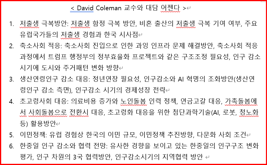 콜먼 교수와의 대담은 제한된 시간 안에 효과적으로 진행되어야 해서, 사전에 토론 주제를 정리해서 보냈습니다. 나는 저출생 문제의 극복 방안, 축소사회 적응을 위한 대응 전략, 이민정책 등 6개의 범주로 나누어 총 19개의 질문을 준비했습니다.