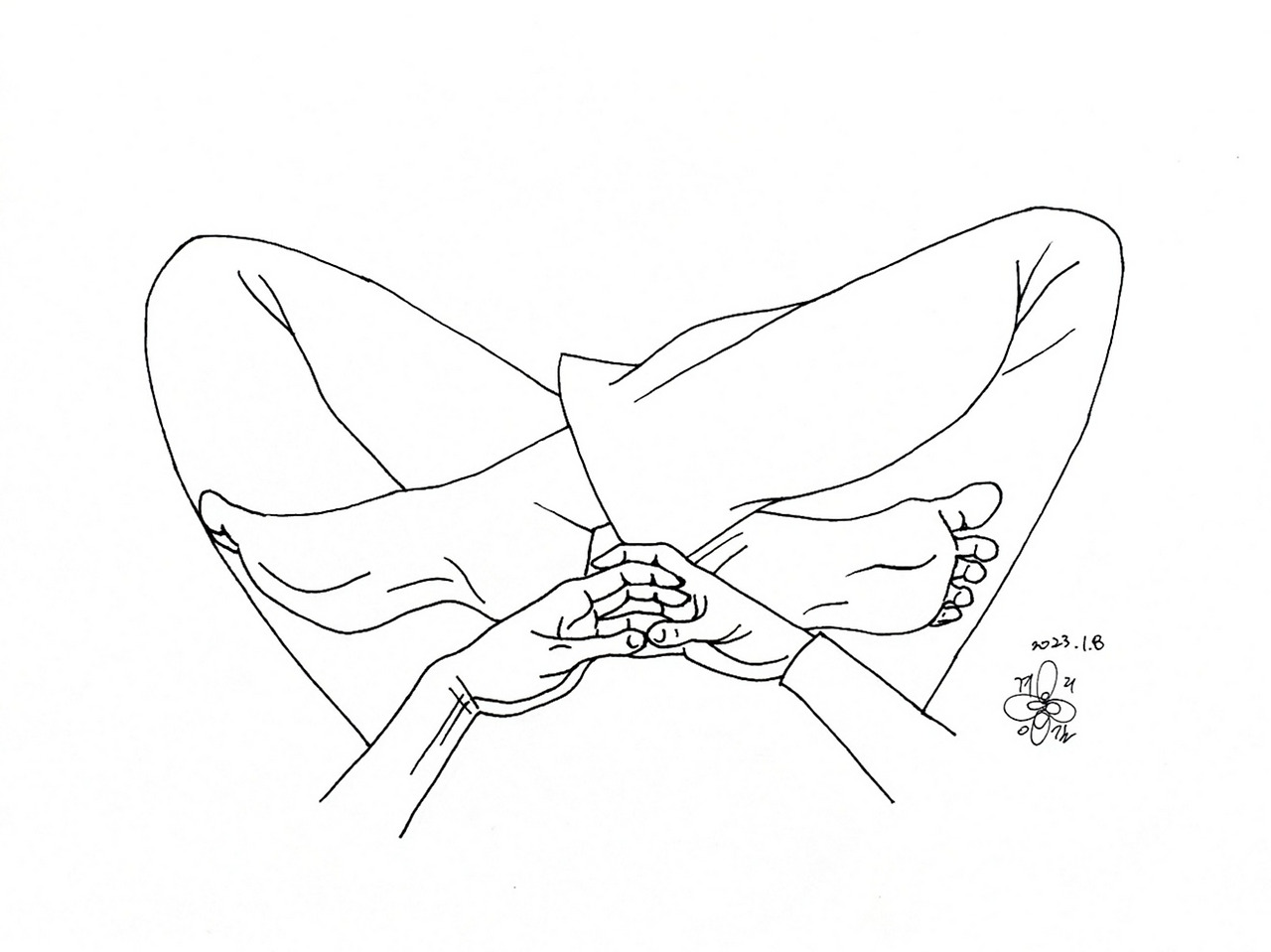 이 다리 모양은 십여 년 전 명상 집중 수련을 하러 갔을 때 미얀마에서 오래 수행하신 명상 스승님이 일러주신 자세입니다. 미얀마의 스님들이 장시간 좌선을 하면서 다리가 저리지 않도록 고안한 방법이라고 들었어요. 확실히 발이 서로 겹치지 않기 때문에 오래 앉아 명상하기에 좋은 방법입니다. 친 무드라의 손 모양은 이 다리 모양과 잘 어울립니다. 발을 저렇게 앞뒤로 겹쳤을 때 뭔가 하체 쪽이 느슨하게 풀리며, 무릎이 붕 떠오를 것만 같은데 거기에 각각 손등을 저렇게 올려놓으면 구조적으로 안정되면서 한결 편안해집니다. 또한 엄지와 검지 끝을 모아서 자물쇠처럼 집중력이 흩어지지 않게 잠그는 느낌을 줍니다. ‘의식’이라는 친 무드라의 뜻처럼 내가 지금 명상을 하고 있음을 자각하게 하며, 약간의 졸음 방지 효과도 있는 듯합니다.