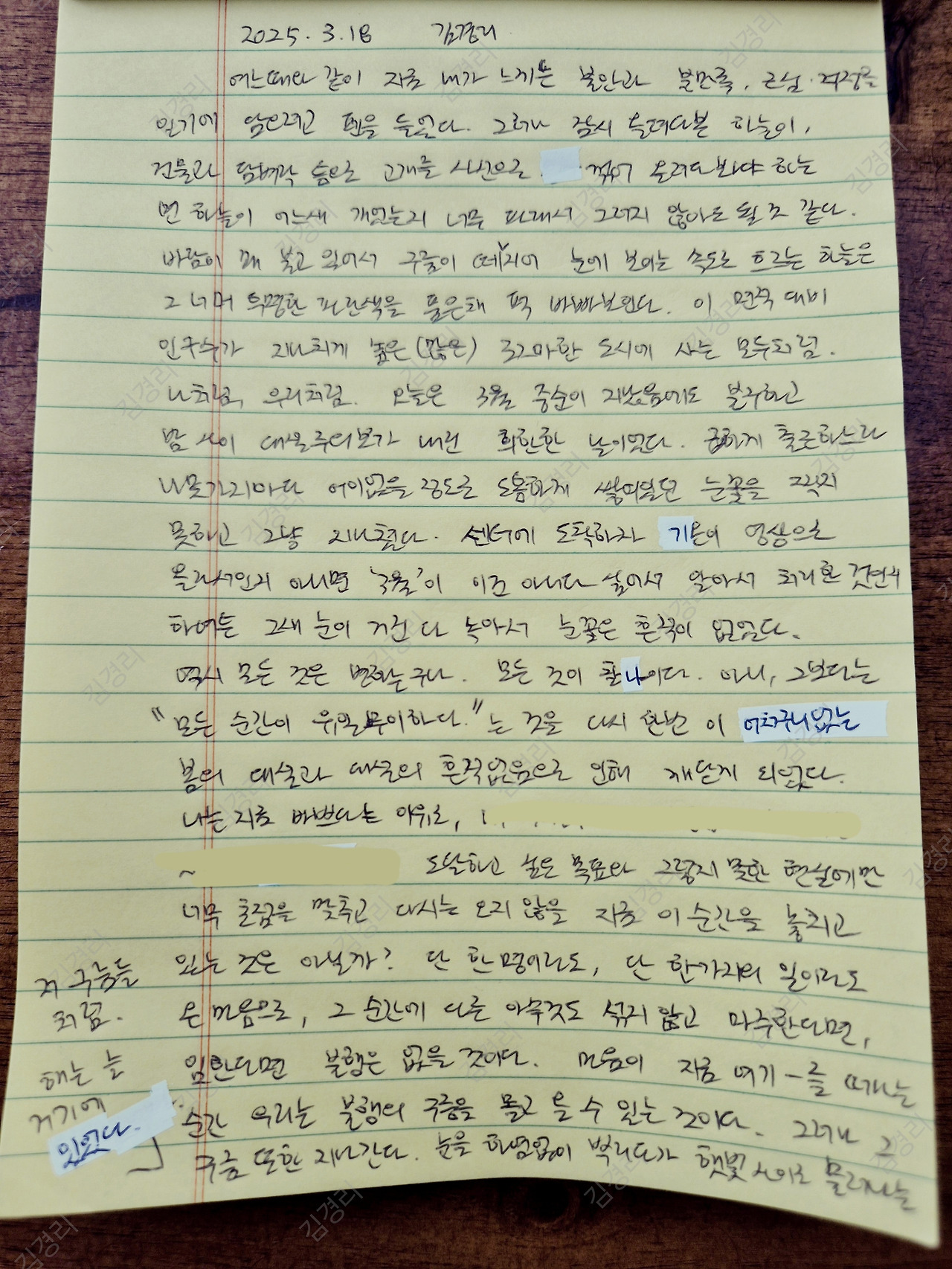 어제는 3월 중순이 지났음에도 대설주의보가 내린 날이었는데요~ 오전에 쏟아지던 눈이 금세 사라진 걸 보고 아래 글을 썼습니다. 한편 글씨가 악필이라 참 다행이라는 생각이 들면서... 쑥스럽