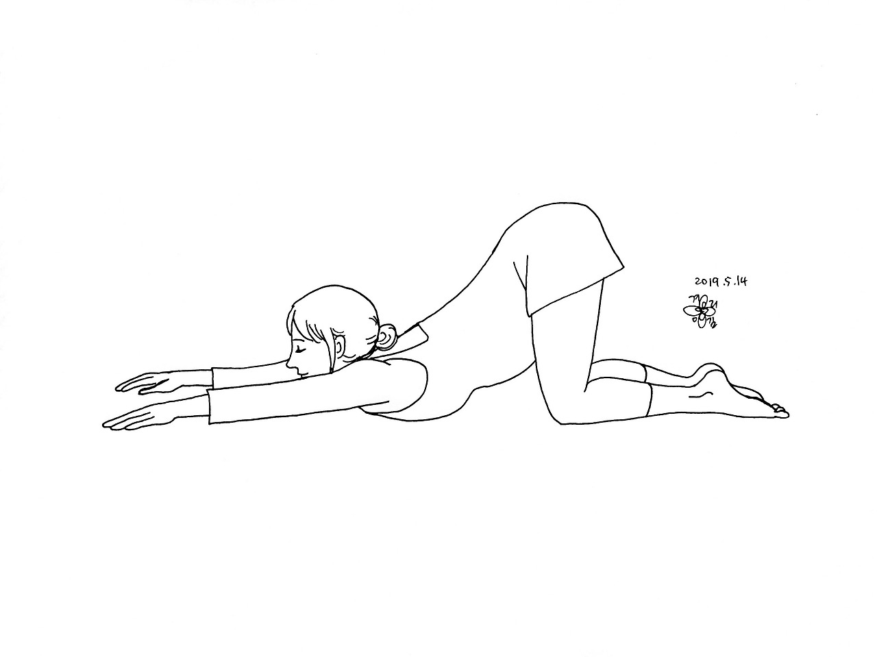 양손과 무릎을 바닥에 댄 자세(테이블 자세)에서 몸 전체를 뒤로 밀었다가 턱과 가슴을 바닥에 내리며 천천히 팔을 앞으로 뻗었습니다. 골반은 무릎에서 수직에 가깝게 하고 발등을 내렸습니다. 아무래도 낯선 동작이기에 마냥 편하지는 않았어요. 초반에는 가슴이 바닥에서 많이 떴습니다. 뭔가 상당히 어색한 자세였음에도 유지하고 있다 보면 평소 눌려 있던 골반과 방광, 그 밖에 장기들이 비로소 숨을 쉬는 듯한 느낌이 들었습니다. 그리고 임신 7개월째, 다시 병원에 검진을 받으러 간 날에 아기가 한 바퀴 돌아서 다시 제대로 자리를 잡았다는 말을 들었을 때는 왈칵 눈물이 났습니다. 첫 임신이었기에 모든 것이 두려운 마음이었지만 그래도 아기가 역아에서 돌아왔다는 것만으로도 큰 위안이 되었습니다. 저를 그토록 괴롭히던 방광염 증세도 없어졌습니다.