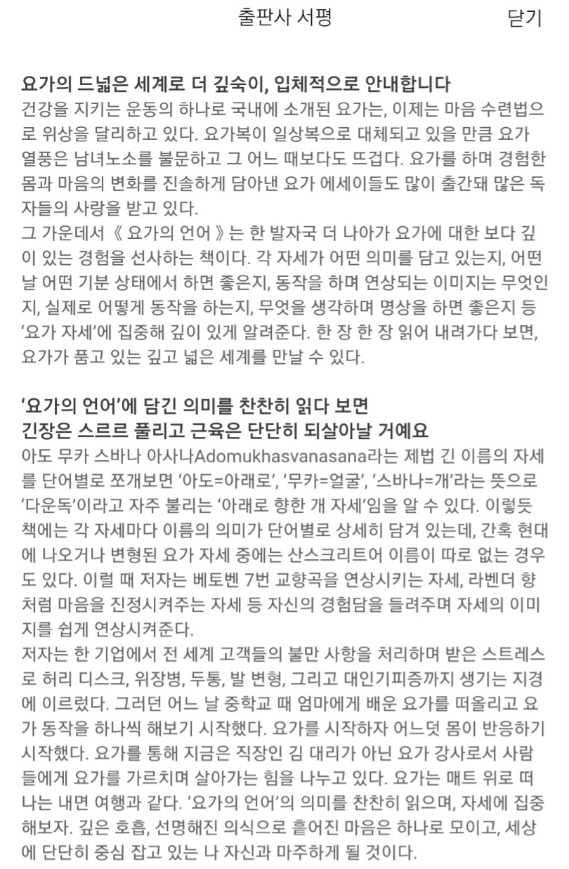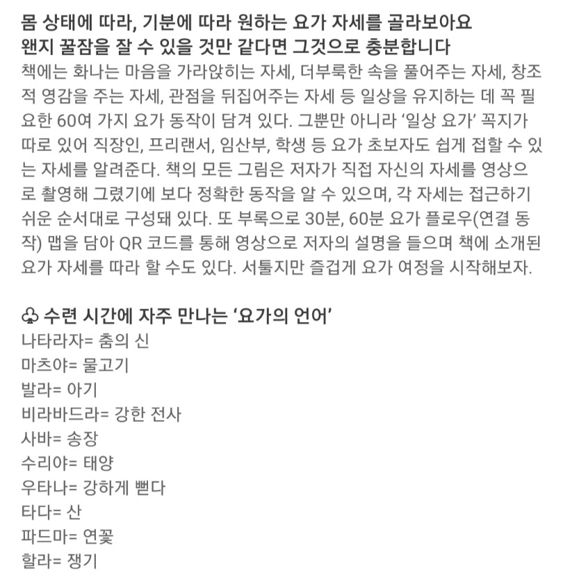 요가, 나를 살리는 몸과 마음의 언어요가의 첫인사이자 끝인사, “나마스떼Namaste”는 ‘당신과 내 안의 신성한 빛에 경배합니다’라는 뜻이다. 요가 수련을 하다 보면, 아도 무카 스바나 아사나, 우르드바 프라사리타 에카 파다 아사나, 아르다 받다 파드마 파스치모타나 아사나처럼 마치 외계어와 같은 요가 자세(아사나)의 이름을 숨 쉬듯이 ...