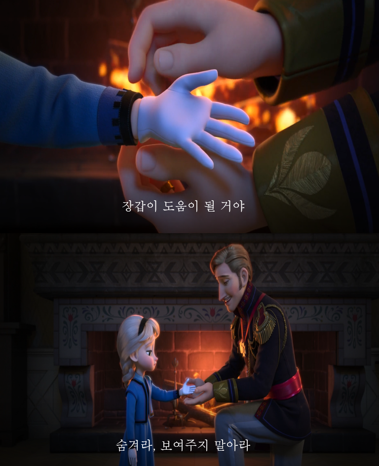자식의 고통을 참을 수 있는 부모가 어디 있을까? 엘사 부모는 두려움으로 자신을 통제하지 못하는 엘사를 위해 아렌델 성문을 닫는다. 두려움으로 고통받고 있는 엘사를 위해 장갑을 끼워준다. 아버지가 준 장갑을 낀 엘사는 세상과 다름에 문을 닫고 아이는 바깥세상과 이별을 선택한다.