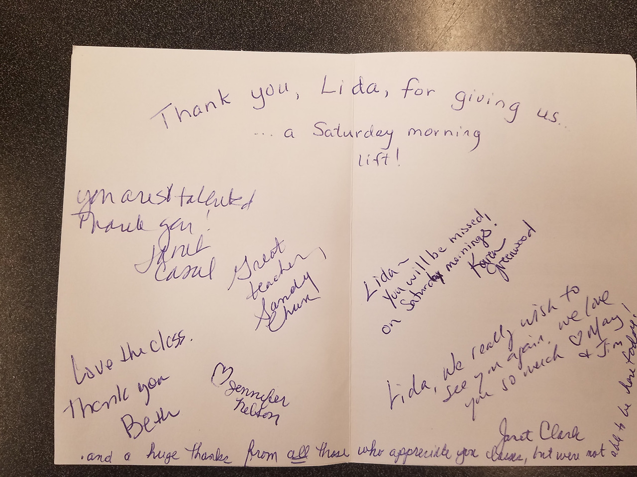 7월 29일 마지막 수업을 하였다. 많은 학생들이 열심히 수련을 하였고 아사나가 끝난 후 평소보다 길게 명상의 시간을 가졌다. 나마스떼를 하고 평온한 마음과 따뜻한 시선으로 학생들을 바라보며 매니저와 월요일에 만나기로 했다는 소식을 전하였다. 학생들이 박수를 치며 좋아하였다. 그때 갑자기 누군가 문을 두드리는 소리가 나서 일어나 문을 열어주니 요가 대사(Yoga Ambassador) 자넷(Janet) 이 붉은 장미 한 송이와 봉투 두 개를 들고 서 있었다. 갑자기 나를 와락 껴안으며 그동안 너무 고마웠다며 학생들이 모아서 이것을 마련했다고 전해주었다. 울컥 눈물이 나왔다. 감동이 밀려왔다. 늘 부족하다고 생각하고 살았기에 이렇게 넘치도록 사랑받고 있음을 잊고 있었구나.... 그러나 한편 부족하다고 느꼈기에 늘 연습을 게을리하지 않았고 이 꾸준한 연습이 희생이 아니라 좋은 결과물을 만들어내는 투자였던 것을 이제야 알게 되었구나... 비록 학생들은 한 시간의 수업을 받고 가지만 그 학생들 한 명 한 명의 이름을 불러주고 인사하고 웃어주고 안부를 물어주는 것들의 관심과 애정이 건강한 인간관계(Healty Relationship)를 형성하고, 좋은 요가 선생이라는 이미지를 심어줬음에 대한 결과였다. 봉투에는 학생들의 정성 어린 감사의 메시지와 뜻밖의 돈이 들어 있었다. 봉투에는 " Treat yourself, Lida" (리다야 너 자신을 위해 사용하렴.)라고 적혀 있었다.
