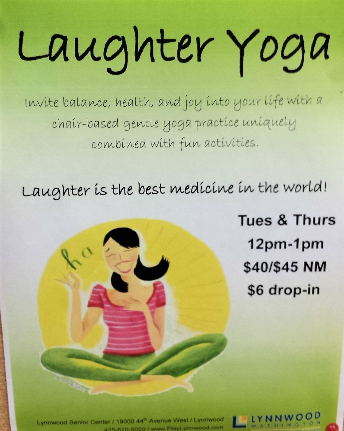 친절하게 안내를 해줬다. 종이를 가져와 무슨 내용으로 이벤트를 할까 고민하는데 요가는 너무 흔하고 이벤트로서 특성이 없으니 내가 잘하는 것은 ‘크게 웃는 것’ 그래서 요가 앞에 ‘웃음’(Laughter)을 넣어 ‘웃음요가’를 하기로 결정하고 계획서를 제출하였다. 일주일 후 결정 났다는 메일을 받고 도서관에 가 보니 도서관 게시판에 내 이름과 ‘Laughter yoga’가 광고되고 있었다. 이 동네엔 한국사람들이 많이 사니 한국인들이 많이 와주기를 기대하며 토요일 오후에 이벤트를 시작하였다. 20여 명 정도의 사람들이 매우 궁금한 얼굴로 참여하였는데 의외로 참가자 명단에 한국인은 한 명도 없었다. 도서관 매니저의 인사말과 내 소개가 있은 후 모두 의자에 앉아 약간의 요가 동작을 한 후 수업을 시작하면서 말하였다.