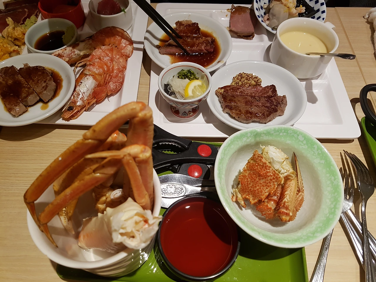 아무튼 이곳의 뷔페는 소위 ‘역대급’, ‘인생 맛 집’의 수준이다. 밥, 우유, 두부, 김, 젓갈, 감자, 낫또, 참치 뱃살, 대게, 털게, 단새우, 연어, 이꾸라, 오징어, 어묵, 스테이크 등... 양도 많지만 맛 또한 기가 막히다. 게를 좋아하는 사람이라면 특히 추천이다. 삿포로에서 굳이 게 무한리필 집에 가지 않아도 될 정도다. 2시간여의 식사 시간 동안 지칠 만큼 게를 제공해 준다.