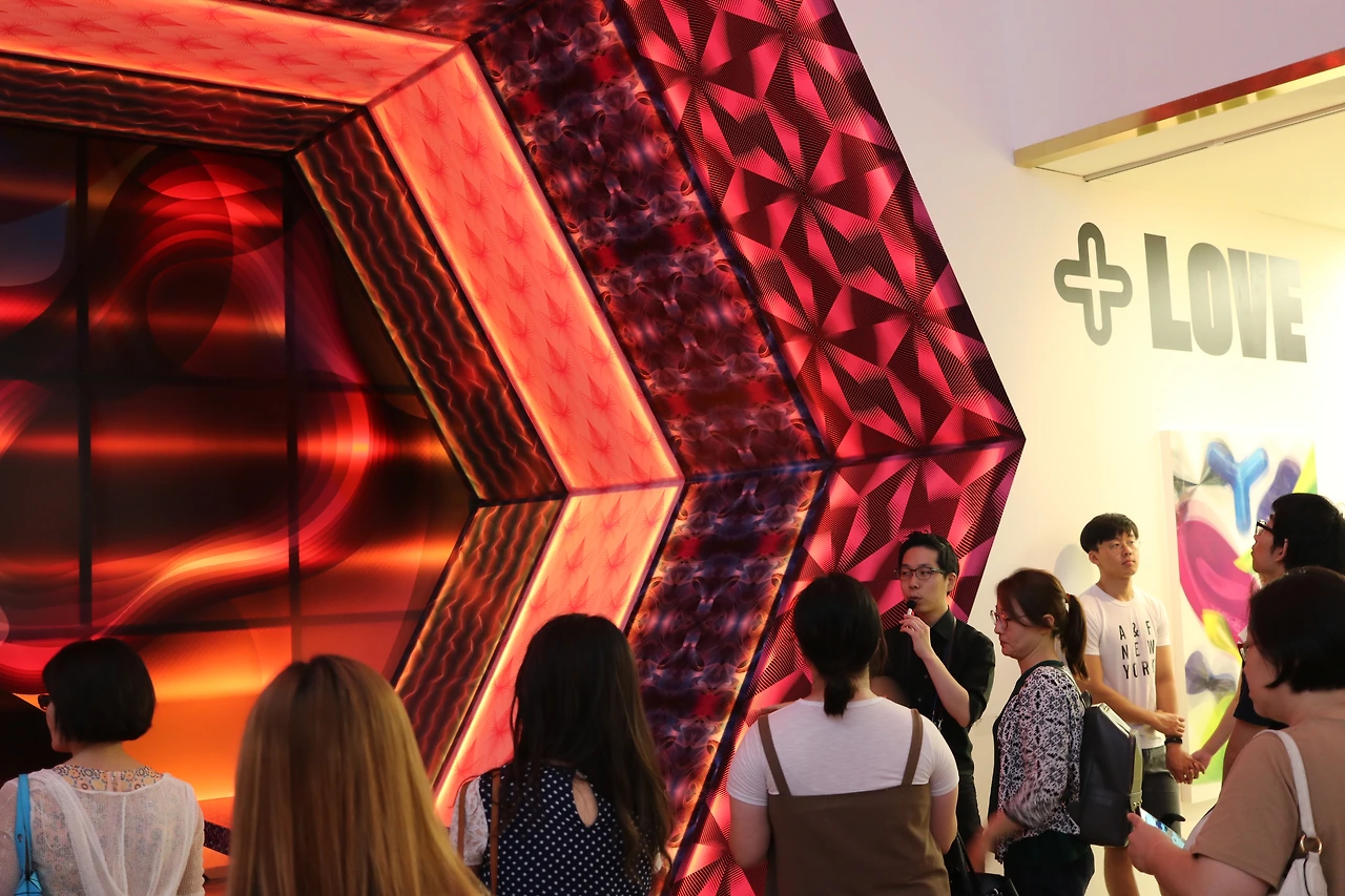 작가는 디지털 시대를 살아가는 우리의 일상생활 모습을 표현하기 위해 2008년 이탈리아 라미네이트 제작업체인 아베트 라미나트의 최신 기술을 이용해서 육각형 콘셉트 하우스를 선보였습니다. 본 작품은 밀라노에서 첫 선을 보였고 많은 관람객의 찬사를 받았습니다. 시간에 따라 벽에 장착된 빛의 색이 변하면서 공간의 분위기가 바뀌는데요. 이 작품 또한 자유롭게 앉거나 만지면서 체험할 수 있습니다. 이번 한국 전시회에서는 새로운 패턴으로 더욱 화려하고 신비롭게 구성한 헥틱 스페이스가 선보였습니다