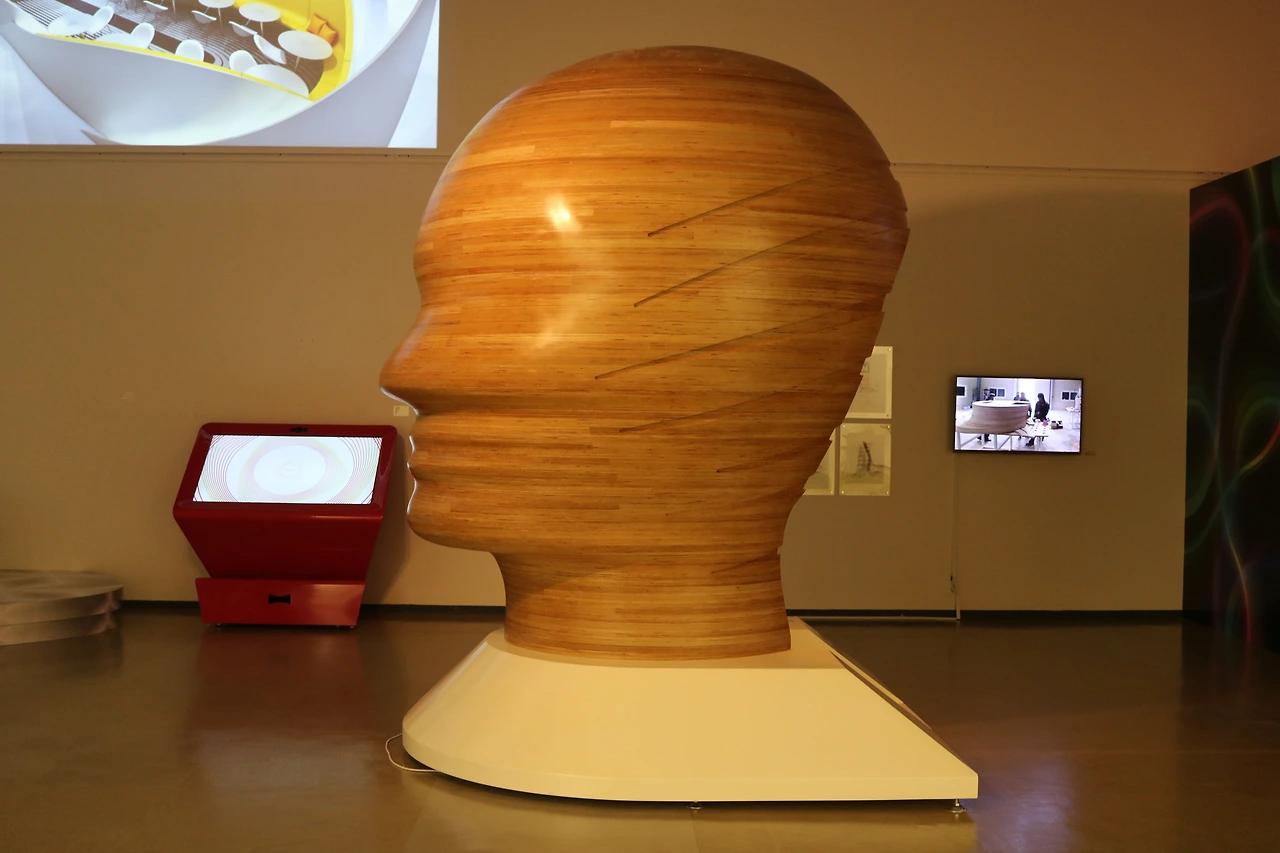 이번 전시회를 대표하는 설치작품입니다. 작가는 2014년 이탈리아 목재 가구 명가인 니바1920과의 협업에서 3미터 높이의 웅장한 '글로벌 러브 카림 라시드 두상'을 만들었습니다. 작가는 이 작품을 한국 전시 기획 초기 단계부터 필수 작품으로 꼽았는데요. 한국 전시를 위해 특별히 새로운 글로벌 러브를 만들었습니다. 관객들은 마치 작가의 머릿속을 들여다보는 것처럼 조형물의 내부로 들어가 작가가 직접 만든 음악의 한복판에 서게 됩니다. (라시드 옹은 디제잉이 취미라고 합니다;) 내부에는 한성재 작가가 제안한 인테리어와 음향, 조명 시스템이 갖추어져 있습니다.
