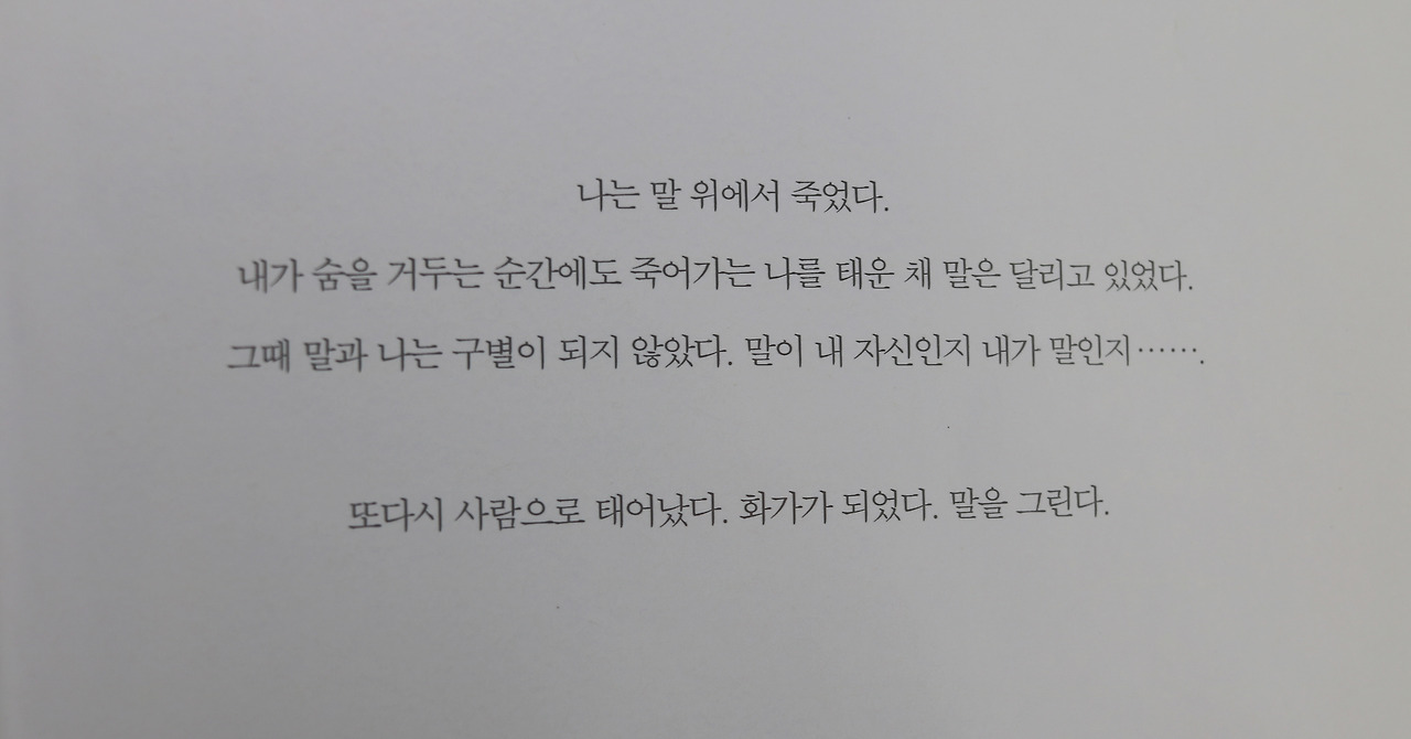 그 날에도 도서관에 가서 아무 책이나 들쳐보았는데, 하필 '죽었다'는 글줄이 여러 번 보이기에 나도 모르게 읽어버렸다. 수필치곤 또 짧아서 그야말로 단숨이었다. 읽고 나니 글의 주인이 예전보다 더욱 궁금했다. 화가 김점선. 지금은 이 세상에 존재하지 않는 사람이다. 그런데 그 사람이 글에서 말하길, 자기는 전생에 말 등 위에서 죽었단다. 한 번도 아니고 여러 번의 인생을 질주하는 말 위에서 종식했노라고 담담히 고백하고 있어서, 이게 정말일까 라는 생각보다는 어쩐지 대단하다는 생각이 들었다. ‘나는 매우 용감했기 때문에, 그리고 물불을 가리지 않았기 때문에(p. 20)’ 최전방에서 적들에게 돌진하다가 죽어버렸다고 회고(?)하는 사람. 화가 김점선의 전생에는 항상 전쟁과 수많은 죽음이 있었나 보다. 그리고 말(馬)도.