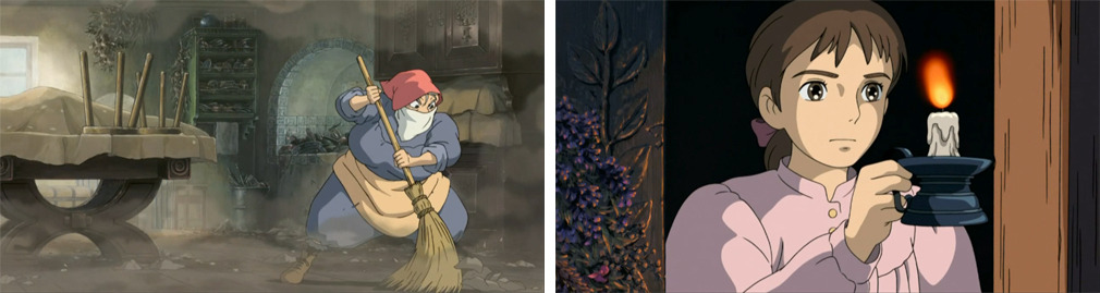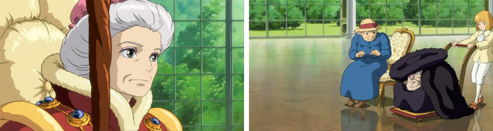 하울과 소피의 관계는 또 어떠한가. 소피는 할머니가 되고 나서 오히려 대담해진다. 자포자기와 비슷한 심정이지만, 예전과 달리 겉모습을 신경 쓰지 않게 되면서 내면의 자아가 부각되는 모습이다. 모험을 두려워하지 않고, 반드시 필요한 순간에는 자신의 의견을 당당하게 피력한다. 왕궁에서 설리만에게 대서는 모습이나 괴물로 변해버린 하울을 보면서 먼저 사랑을 고백하는 모습에는 강인한 내면이 서려있다. 게다가 그녀는 남성이 여성에게 바라는 이중적인 욕망을 모두 충족시킬 수 있는 조건을 갖추고 있다. 낮에는 요리하고 장을 보고 청소하는 전통적인 여성의 역할을 수행해내고 밤에는 싱그러운 열여덟 살 처녀로 변신하는 것이 그것이다. 여성성을 갖고 있어야 하지만, 아직 성적으로 미성숙한 하울을 위협할 정도는 아니어야 한다. 더욱이 하울에게 부재한 다정하고 가정적인 어머니의 역할을 수행할 능력도 요구된다. 할머니 소피는 여러 가지 면에서 하울의 이중적인 욕망을 채워주는 인물이다. 나중에 소피의 저주가 풀리면서 할머니의 모습은 사라지지만 두 사람은 더욱 공고하게 결합한다. 그들은 힘을 잃은 황무지 노파와 늙은 개, 어린아이 마이클까지 받아들이며 독특하지만 누가 봐도 손색이 없는 가족을 이룬다.