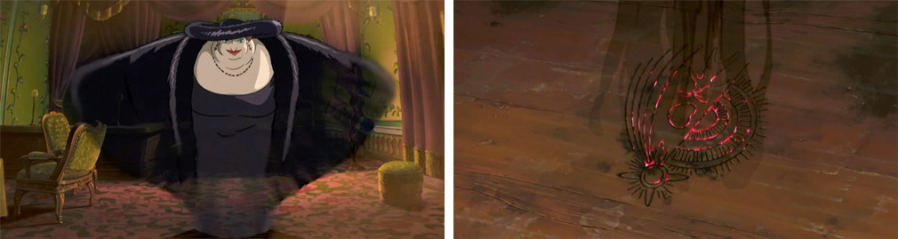 시기는 아마 스승 설리만(=어머니)에게서 막 독립하기 시작한 무렵이었을 것이다. 황무지 마녀에 대한 매력적인 소문을 듣고 먼저 접근한 사람이 하울이다. 그리고 등을 돌리고 달아난 사람 역시 하울이었다. 대체 무엇이 두려웠을까. 아마 자신의 남성성을 압도하는 치명적인 여성성을 발견한 것이 아닐까. 자칫 먹혀버릴 수도 있는 위험을 본능적으로 깨닫고 도망친 것이다. 그 후에도 하울은 황무지 마녀를 무서워하며 자신의 방에 마법이 깃든 온갖 종류의 물건들을 갖다 놓는다. 그토록 위협적이었던 황무지 마녀는 강력한 어머니 설리만에 의해 힘을 잃고 쭈그렁 할머니가 된다. 어머니가 아들의 짝으로 원하는 것은 방탕한 창녀가 아니라 순결한 처녀이다. 설리만이 소피에게 보이는 태도는 특별히 적대적이지 않고 오히려 호의에 가깝지만 황무지 마녀에게만큼은 단호하다. 마녀가 가진 힘, 치명적인 성적 매력은 하울이 아니라 강력한 모성을 대변하는 설리만에 의해 제거당한다. 설리만은 또한 자신에게서 벗어나려고 하는 하울과 소피를 쫒지만 끝까지 적극적인 조치를 취하지는 않는다. 개를 감시로 붙이는 것은 어머니로서의 영향력을 포기할 수 없는 최후의 욕구이다. 며느리는 들이겠지만 아들의 세계에서 완전히 밀려나는 것은 용납할 수 없다. 설리만은 애니메이션이 끝날 즈음 다시 한번 등장하며 모성의 건재함을 과시한다.