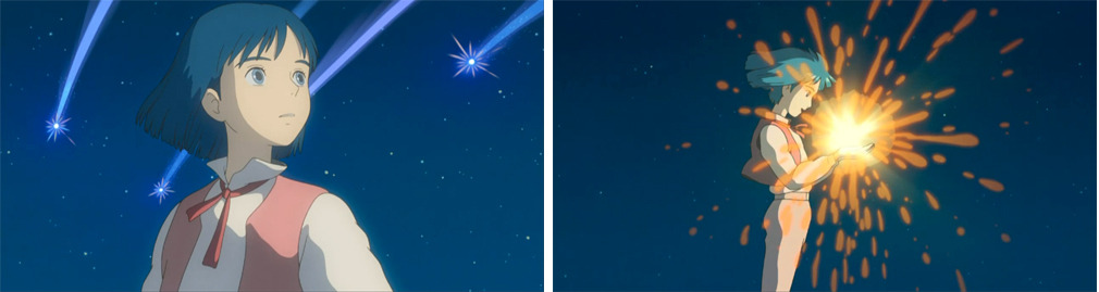 좋은 영화나 애니메이션을 보고 나면 기억에 남는 장면들이 생긴다. 시간이 흘러 스토리나 대사가 생각나지 않아도 어떤 장면은 스냅사진처럼 고스란히 떠오른다. 십여 년 전 하울의 움직이는 성을 보았을 때는 밤하늘에 호선을 그으며 떨어지는 유성이 자꾸 생각났다. 호수 부근에 떨어져 깨어지고 다시 총총 튀어가는 별 부스러기가 참 별나 보였다. 딱히 보는 사람도 없는데- 아니 소년 하울뿐인데 왜 그렇게 난리를 피우는지 신기하고 궁금했다. 그들의 비행은 언뜻 보기에 유희 같았지만, 사실상 죽음의 의식이나 다름없었다. 지상에 몸 닿는 순간 사라져 버리는 일이었다. 유성의 자유낙하에 의지가 있을 리 없지만 애니메이션 속의 유성들은 왠지 사람 같았다. 그래서 누군가는 봐주어야 한다고 생각되었다. 그제야 화려했던 난리굿도, 그 밤에 혼자 호수에 나와 있었던 소년 하울도 이해되었다. 소년은 몽유병인 것도 아니고 한가롭게 나들이를 하고 있었던 것도 아니었다. 하울은 떨어지는 별들의 마지막을 지키고 있었다. 일종의 참관인 역할을 하다가, 무슨 조화인지는 알 수 없지만 유언장 대신 평생 계약서를 받아낸 것이라고 해야 할까. 소년 하울은 죽어가는 유성 하나를 붙잡아 껴안는다. 그리고 꿀꺽 삼켜버린다. 소년의 가슴께에서 불이 일렁이는 작고 뭉클한 것이 빠져나온다. 그렇게 소년의 심장을 가진 유성은 다시 소생하고, 소년은 별의 힘을 지닌 독특한 사람으로 자라난다.