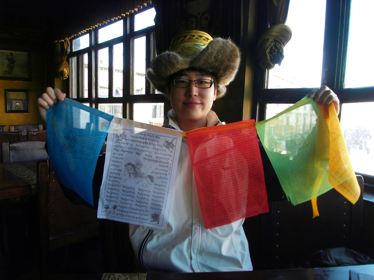 그 순간, 찻집으로 중국 공안들이 들어왔고, 티베트 청년은 깜짝 놀라며 탁자에 펼쳐놓았던 타르초와 티베트를 탁자 밑으로 숨기며 이내 자리를 떴습니다. 우리의 대화는 그렇게 갑자기 중단되었고, 저는 지금 이 순간이 일제 통치를 받던 식민지 조선 경성의 모습과 매우 닮아있다는 생각이 들었습니다. 그래서 저는 티베트 대학생이 설명해 준 타르초를 양손에 들고 마치 식민지 조선 독립군의 모습처럼 기념사진을 찍었습니다. Free Tibet!