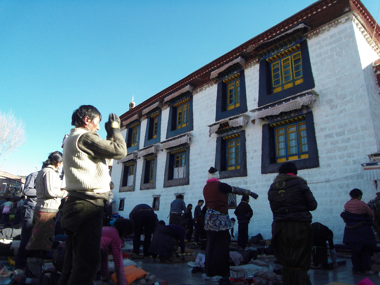 티베트 라싸는 역대 달라이라마의 시신이 안착되어 있는 포탈라궁이 있기에 의미가 있습니다. 그래서 많은 티베트인들이 오체투지를 하면서 이곳 라싸로 순례를 오는 것입니다. 순례객들은 포탈라궁을 들른 후 순례길의 종착지인 조캉사원으로 향합니다. 조캉사원으로 가는 길을 바코르라고 하는데 순례객들은 이 바코르를 역시 시계방향으로 오체투지를 하며 돕니다. 바코르에는 순례하는 사람들과 여행객들이 이리저리 섞여서 매우 혼잡합니다. 바코르를 한 바퀴 돌아 조캉사원의 광장에 들어서니 순례객들이 조캉사원 벽을 향해 절을 하고 있습니다. 그 모습이 마치 이슬람 성전에서 수많은 무슬림들이 절을 하는 모습과 흡사하다고 생각이 들었습니다. 어지러운듯하면서도 일사불란하게 절을 하는 사람들 위로 바람의 말이라는 의미를 담고 있는 오색 타르초가 무수히 펄럭이고 있습니다.
