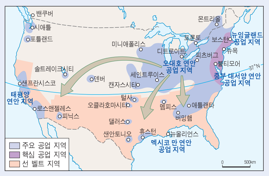 1920년대 미국의 성장을 이끈 것은 자동차 산업입니다. 자동차의 왕이라 불리는 헨리 포드를 비롯하여 GM과 같은 미국의 자동차 기업들은 오대호 연안의 공업 도시 디트로이트에 밀집하였습니다. 당시 디트로이트는 미국에서 가장 산업이 발달한 도시이자 자동차의 도시, 모타운(Mo Town)이라 불렸습니다. 하지만 1970년대 이후 일본, 대한민국 같은 신흥 공업국의 등장으로 미국의 자동차 산업은 쇠락의 길을 걷게 됩니다. 그 결과 오대호 연안의 공업지역은 녹슨 지역이라는 뜻의 '러스트 벨트'로 전락하고 맙니다. 반면 같은 시기 남서부 도시들(샌프란시스코, 오클랜드, 산호세)에서 컴퓨터 산업이 발달하면서 미국 산업의 중심지가 오대호 연안에서 태평양 연안으로 움직였습니다. 이곳은 오대호 연안 공업 지역에 비해 따뜻한 남쪽이기 때문에 선벨트라 부릅니다.