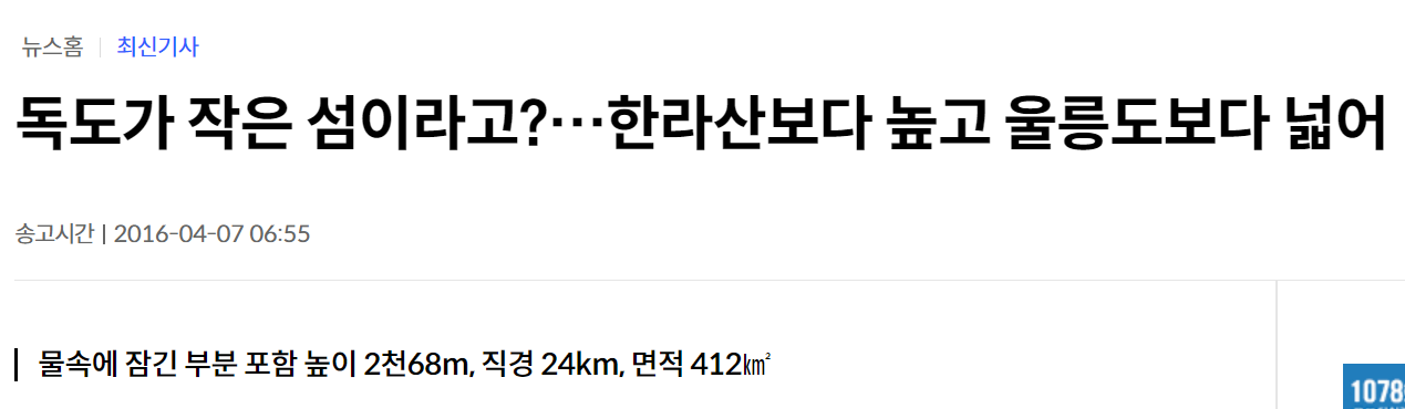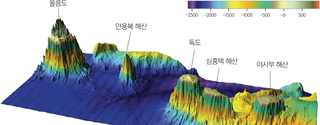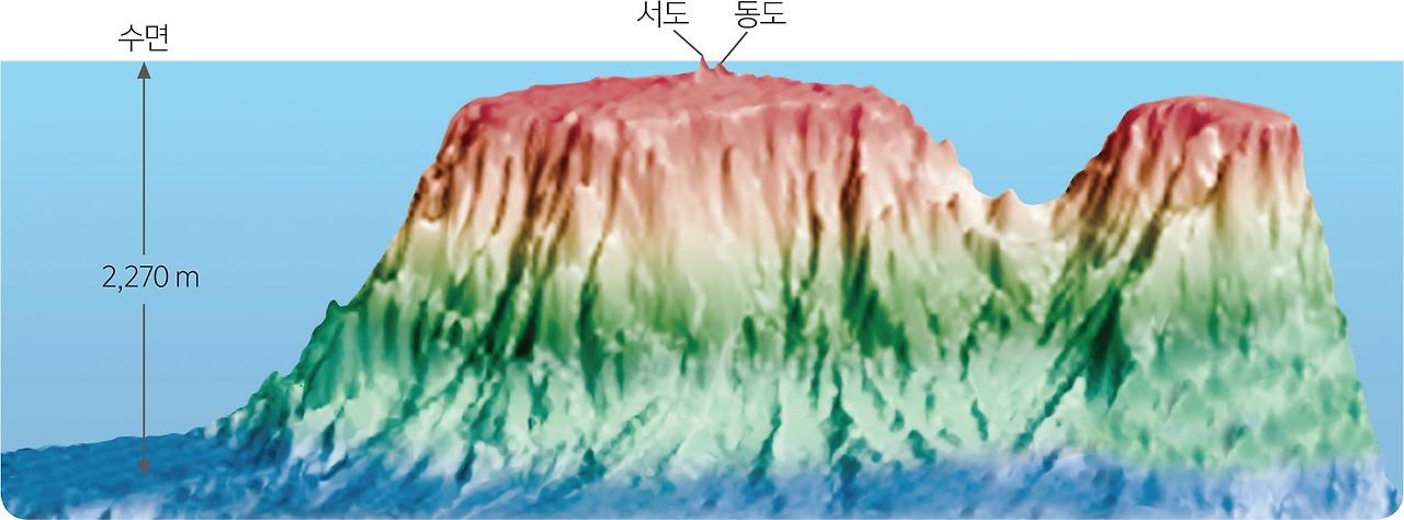 혹시 제가 이 책의 서두에서 강조했던 문장을 기억하시나요? 바로 '섬은 산이다!'라는 말이죠. 독도야말로 이 전제를 가장 정확히 증명하는 섬입니다. 우리가 눈으로 보는 독도는 동도(98.6m)와 서도(168.5m)라는 두 개의 작은 봉우리에 불과하지만, 바닷속에 감춰진 독도의 진짜 크기는 우리의 상상을 초월합니다.