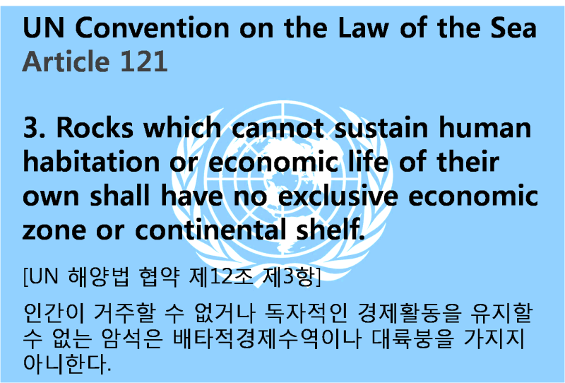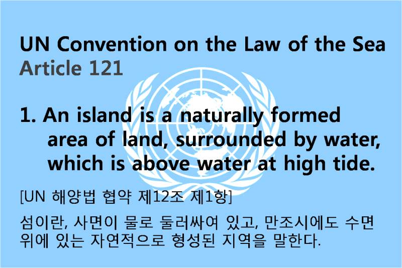 유엔해양법협약(UNCLOS) 제121조에 따르면 섬이란 '물에 둘러싸여 있으며 밀물 때에도 수면 위에 있는 자연적으로 형성된 육지 지역'으로 정의됩니다. 독도는 동도와 서도를 비롯한 89개의 부속 도서가 모두 밀물 때에도 수면 위에 당당히 노출되어 있으므로 이 조건을 완벽히 충족합니다. 나아가 같은 조 3항에는 ‘인간이 거주할 수 없거나 독자적인 경제생활을 유지할 수 없는 암석은 배타적 경제수역(EEZ)이나 대륙붕을 가질 수 없다’고 명시되어 있습니다.