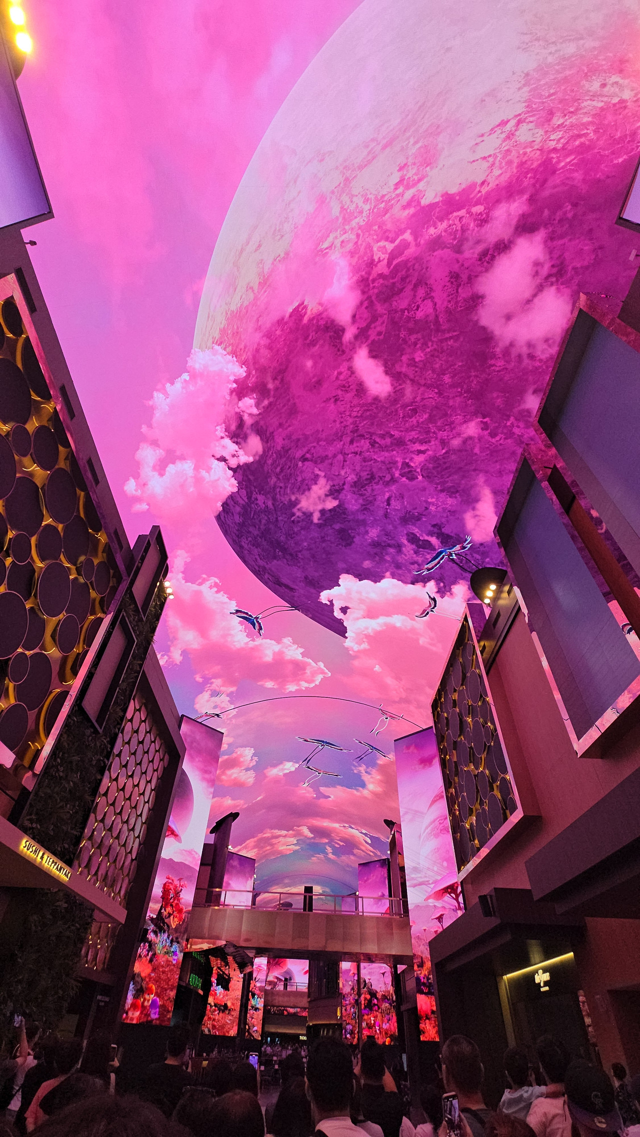 저는 최근 MZ세대의 인생 샷 성지로 불리는 인스파이어 리조트를 방문했습니다. 이곳의 하이라이트는 '오로라'라고 불리는 디지털 스트리트입니다. 무려 150m에 달하는 초고화질 LED 스크린이 천장과 벽면을 가득 채운 이 공간은 단순히 화면을 보는 것을 넘어 공간 전체가 하나의 살아있는 생물처럼 느껴지게 합니다. 매 정시마다 펼쳐지는 디지털 쇼는 광활한 세렝게티 초원의 일출부터 신비로운 숲속의 요정들, 그리고 거대한 핑크 고래가 머리 위를 유영하는 환상적인 바닷속 풍경까지 압도적인 화질로 구현해 냅니다. 고개를 들어 천장을 바라보고 있으면 파도 소리와 고래의 울음소리가 온 몸을 감싸며 마치 섬이라는 물리적 제약을 벗어나 미지의 가상 세계로 빨려 들어가는 듯한 착각에 빠지게 됩니다.