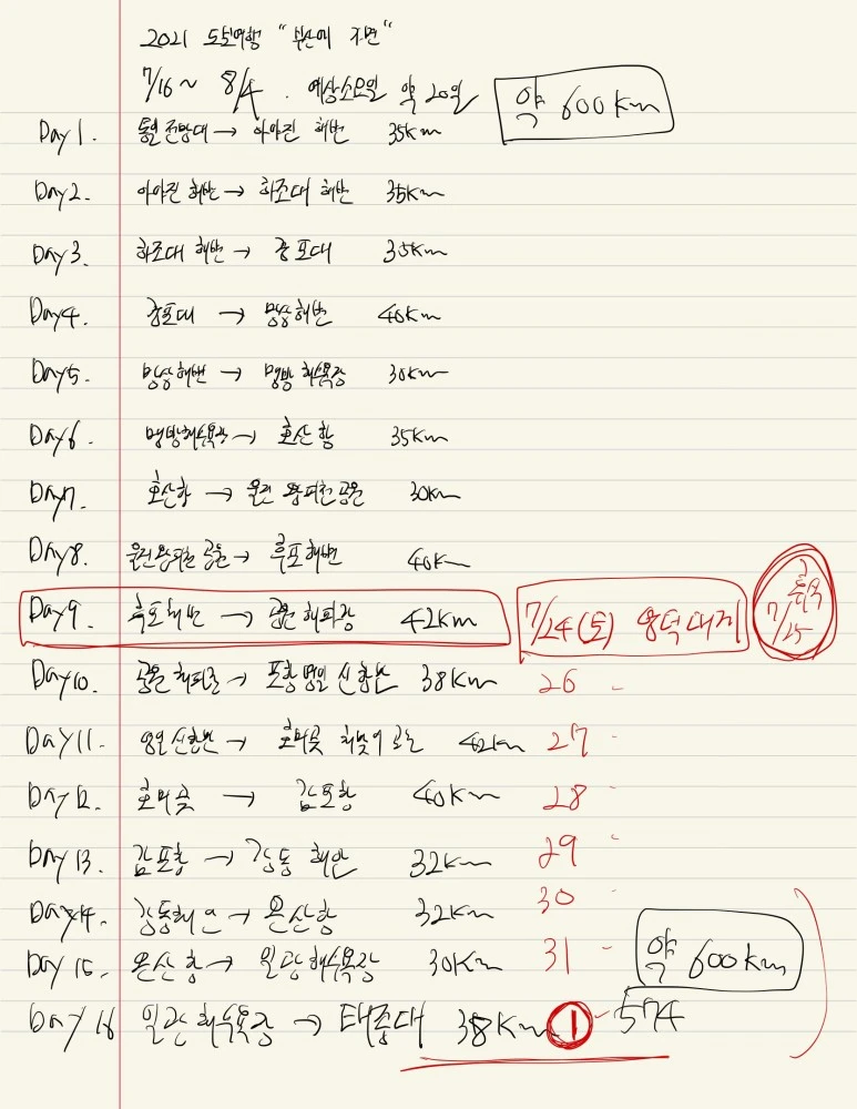 출발일은 여름방학이 시작되는 날인 2021년 7월 16일. 전날 방학 전 마지막 수업이 마친 여행 지리 수업이었다. 이제 곧 있으면 수능 원서접수를 하는 3학년 학생들에게 내가 왜 이 폭염 속에서 도보여행을 떠나게 되었는지에 대해 이야기하였다. 인생에서 매우 중요한 시기를 겪고 있는 고3 제자들에게 조금이나마 동기부여가 되었으면 하는 바람이 있었다. 물론 이렇게 학생들 앞에서 도보여행을 떠나는 각오에 대해서 말하면서 나 스스로에게도 응원의 에너지를 전달하고자 하는 바람도 있었다.