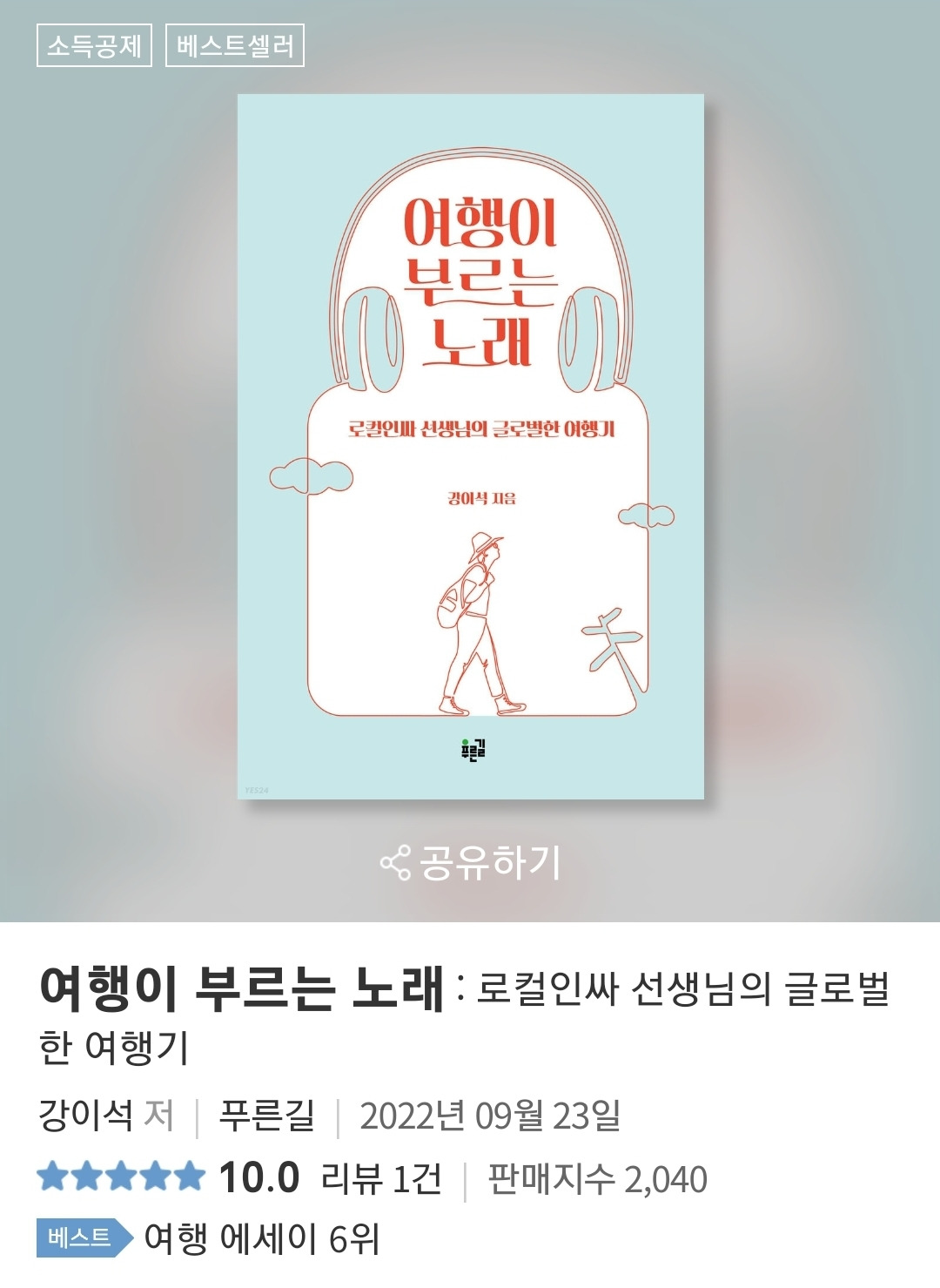 지난주, 2022년 9월 7일 내가 쓴 책 '여행이 부르는 노래'가 세상에 처음 나왔다. 2019년 12월, 크리스마스가 얼마 남지 않았을 때 처음 글을 쓰기 시작했으니까 계산해보니 1000일 만이다. 초기 지인들의 구매와 작은 행운들이 겹쳐서 일주일이 지난 현재까지 여행 에세이 부문 TOP10을 유지하고 있다.