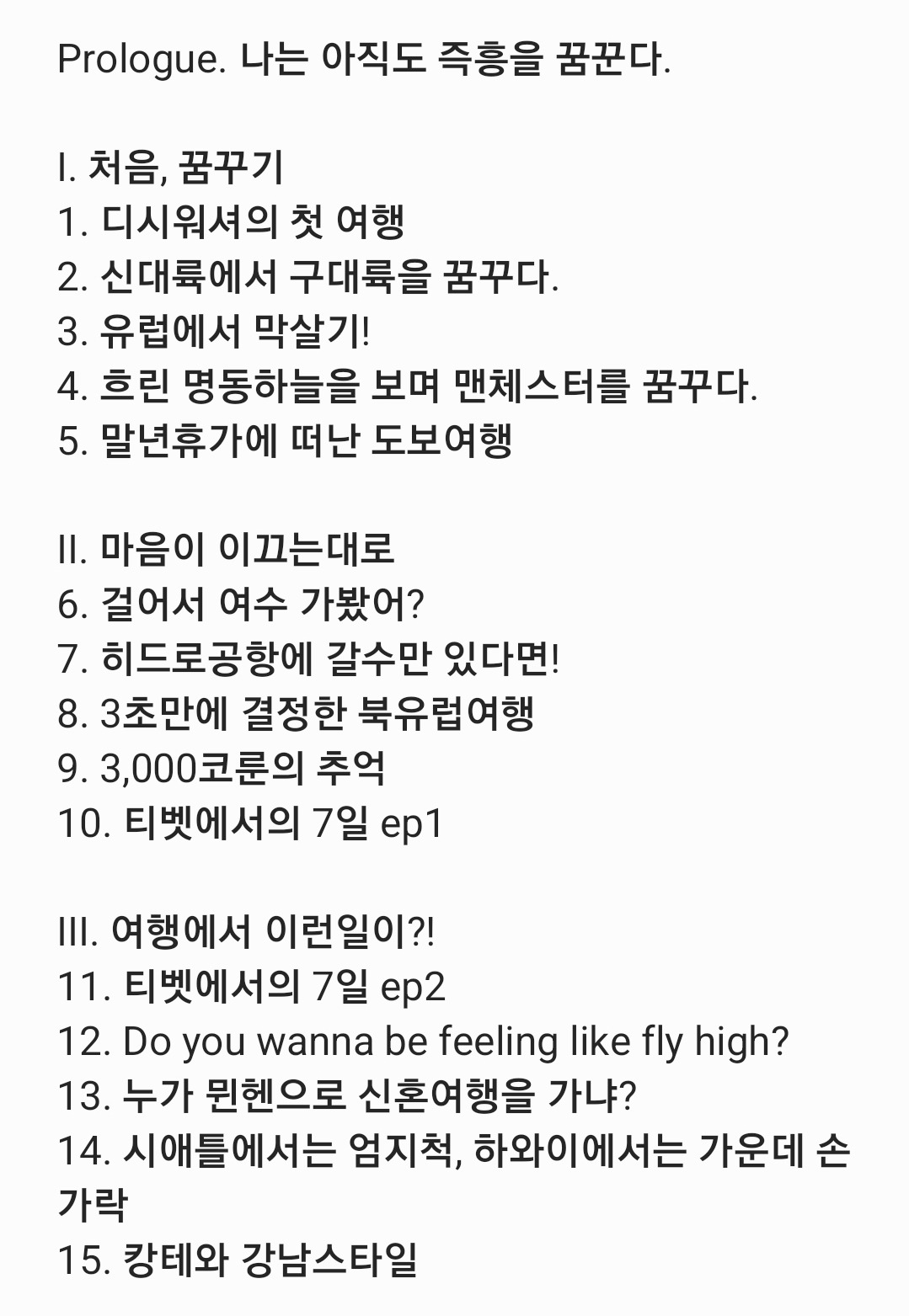 그 말이 용기가 됐는지 그 자리에서 바로 책을 구상했다. 디자인은 정말 심플한 흰색 바탕에 검은색 궁서체, 제목은 말 그대로 '여행책'. 20대의 끝자락까지 다녔던 여행과 일상의 모든 순간들을 음악과 함께 버무려보자는 생각이 불현듯 슬며시 들었다. 당시에는 QR코드가 대중화되지 않았기 때문에 음악을 여행 이야기와 어떻게 아우를지 구체적인 아이디어는 나오지 않았었다.