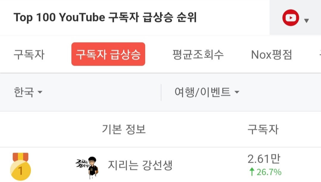 대한민국 여행 유튜버 중 구독자 상승률 1위!