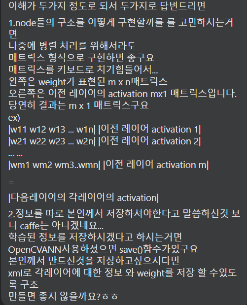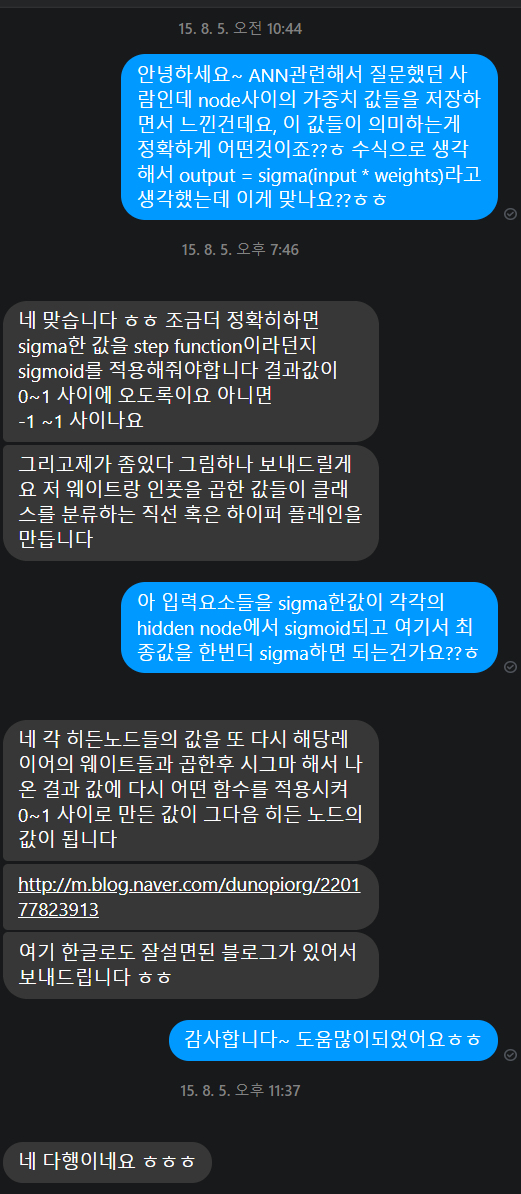 그 이후에도 Neural Network를 어떻게 해석하면 되는지 그 내부적인 작동 원리를 이해해야 했었다. Neural Network 내에서 Weight나 Bias, Hidden node, Sigmoid가 무엇인지 하나하나 알아보면서, "아 이게 그런 거구나"하면서 하나씩 배워나갔었다. 당시에는 정말 물어볼 사람이 없어서 궁금한 게 생기면 페이스북의 머신러닝, 통계, AI 그룹에 질문 글을 올렸었다.
