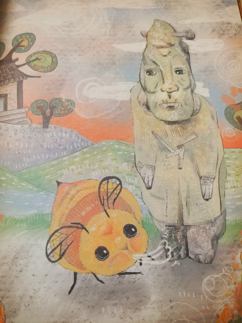 꿀을 모으고 돌아가는 길에 장승을 만났어요. 절 마당에 서 있는 돌장승을요. 얼굴은 닳아서 두꺼비 등처럼 우둘투둘했고, 몸에는 주름이 쭈글쭈글한 할매였어요. 할매는 일제 강점기 때 땅속에 파묻혔다 되살아났어요. 나이가 삼백 살이 넘었음에도 살아갈 날이 무한한 존재였어요.