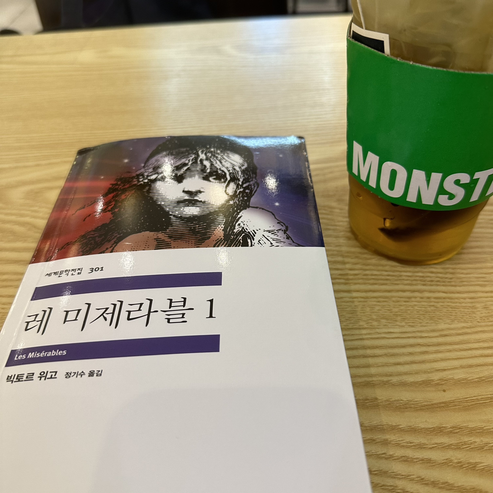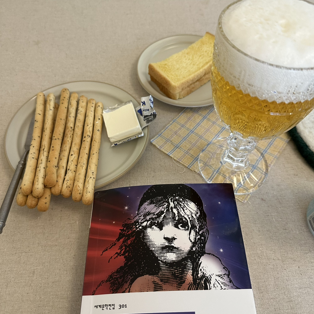 어제까지 토지 3권을 다 읽었다. 오늘부터 레미제라블을 읽기 위해 가방에 챙겼다. 퇴근 시간과 운동 시간 사이 짬나는 동안 카페에서 책 읽으려고 어디 갈지 고민했다. 참새가 방앗간을 지나칠 수 없다고, 스쿼시 센터와 가까운 치우친 취향 책방에 갔다. 어제도 갔는데 오늘도 갔다. 어제는 시원한 차를 마셨고, 오늘은 무알콜 맥주를 시켰다. 출출해 쿠기도 시켰다. 사장님께서 샌드위치도 나눠 주셨다. 먹고 있는데 사장님도 나도 아는 분이 오셨다. 그때부터 신나는 이야기가 이어졌다. 스쿼시 우리 반 사람끼리 있는 단체 톡방에 5시 반까지 가겠다고 남겼지만 쉽게 엉덩이를 뗄 수 없을 정도로 끝없는 이야기가 펼쳐졌다. 책방에 들어가 주문한 음료와 간식을 받고 표지가 나오게 책을 두고 사진 찍었다. 표지를 열고 빅토르 위고 작가 소개 몇 줄 읽다 말았다. 나오면서 책을 가방에 다시 넣는데 속으로 한탄이 나온다.