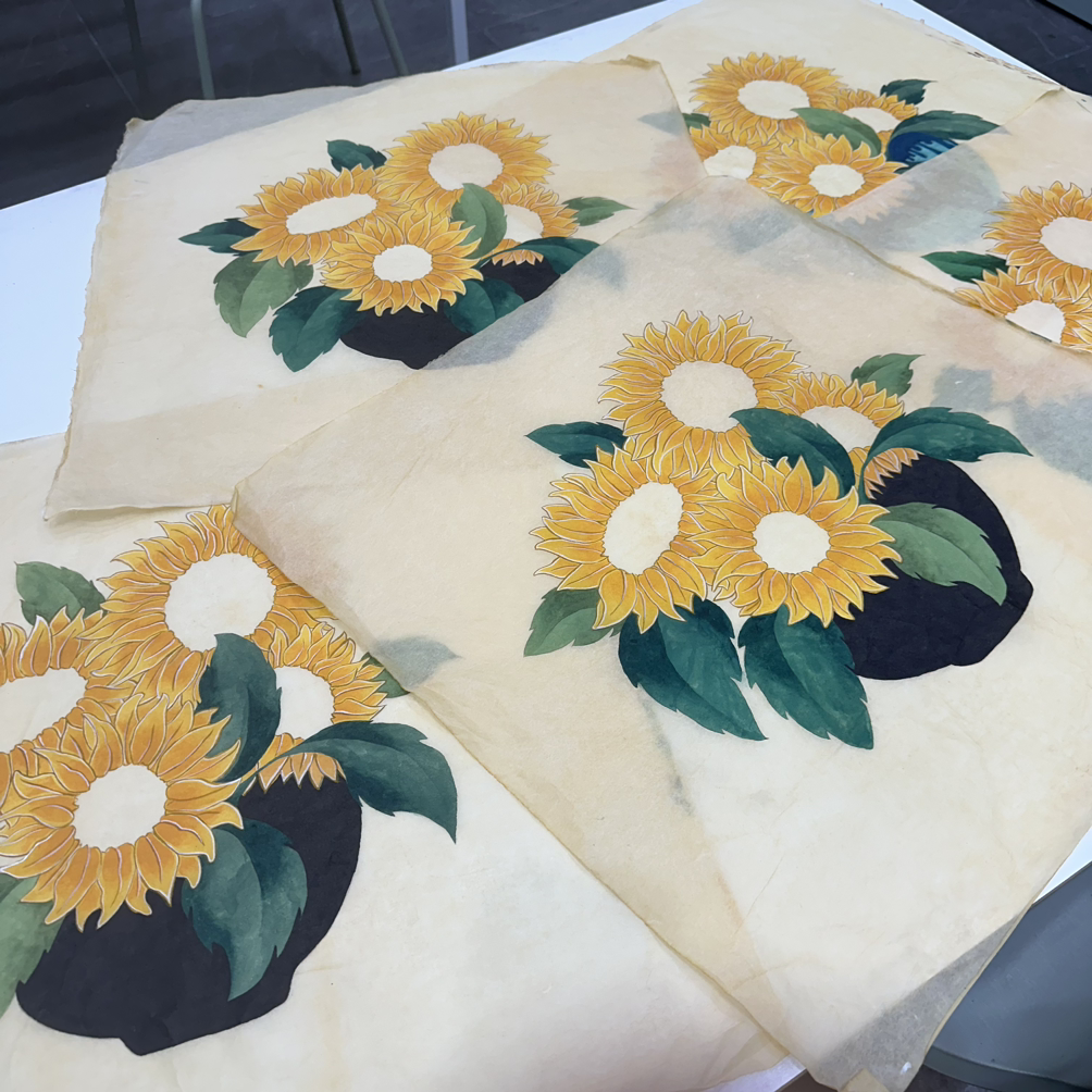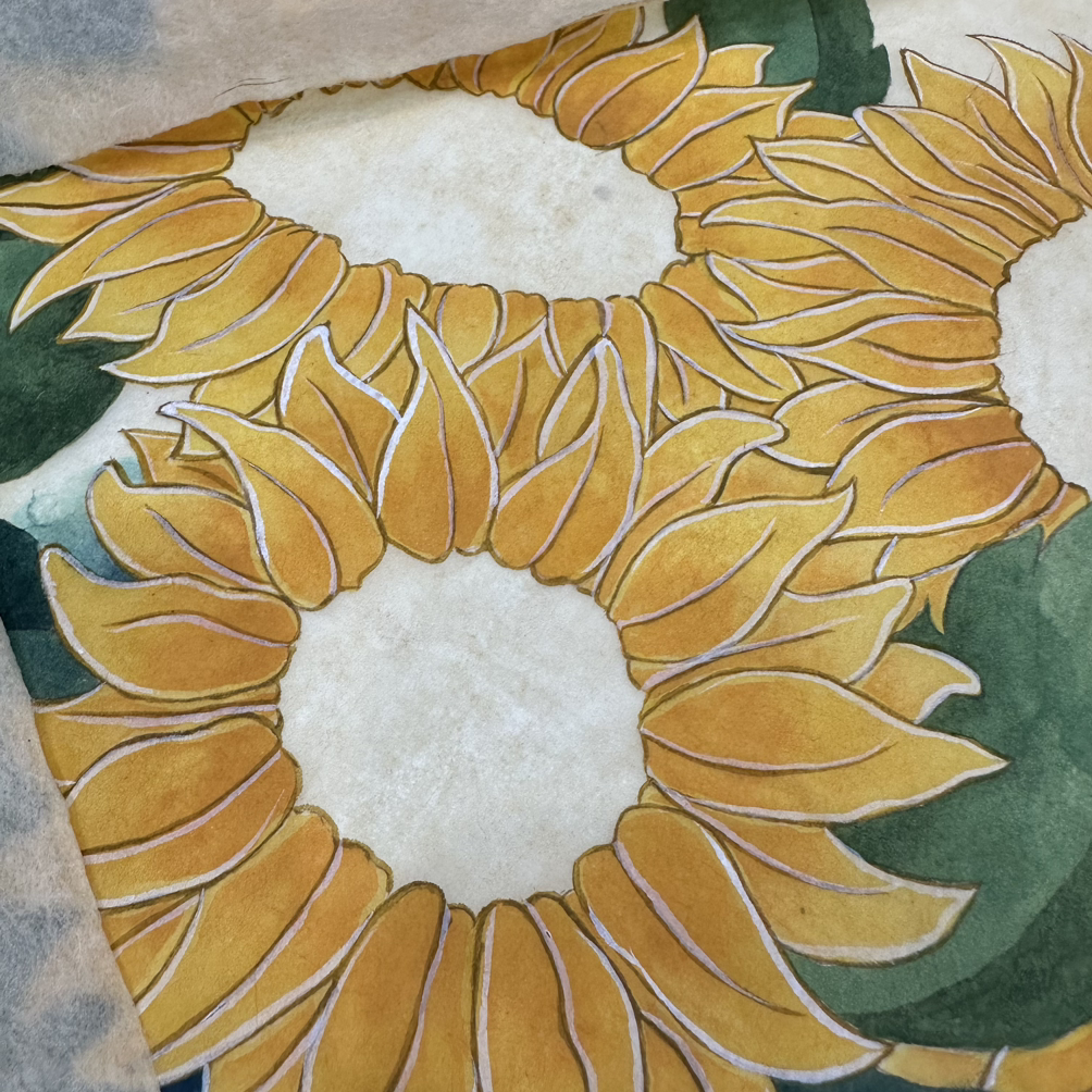이 글을 쓰고 있는 연재 목차를 봤다. 4월 20일 해바라기 도안과 함께 글을 썼다. 선생님과 의논하며 해바라기 도안을 그렸던 민화 수업이었다. 다음 주부터 한지에 그림을 옮기고 한지 바탕색 올리고 뭐 아무튼, 채색에 들어갔다. 말의 요지는 4월 하순부터 해바라기를 그리기 시작했다는 이야긴데… 5월이 되고 친정 아빠 제사, 스쿼시 코치 송별회로 빠지고 선생님 일정으로 휴강하고 했더니 두 달 동안 4번 갔다. 그러니 진도가 나가야 말이지. 더구나 5장이나 그리니 말이다. 화병 하나에 해바라기 4송이가 얼마나 걸린다고. 천만에 만만의 말씀이었다!!(으이구)