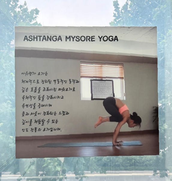 마이솔은 인도 전통 방식의 수련이라고 들었다. 20명이 넘는 공간에 에어컨을 틀어주지 않았다. 선풍기가 뒤에서 돌아가고 창문을 열어두었다. 가끔 불어오는 바람만 느낄 뿐이다. 정말 진심으로 내 자리가 뒤라서 에어컨 바람이 안 오는 줄 알았다(ㅜ.ㅜ). 다들 가볍게 입고 하는 이유가 있었다. 선생님께서 땀 닦을 수건이 작지 않냐고 했다. 가져간 손수건을 보고 하시는 말씀이었다. 몰랐다, 이런 곳인 줄. 5분 만에 땀은 온몸을 적셨다. 한 동작이 끝나고 다음 동작 설명을 듣느라 잠깐 매트에 앉았는데 앉은자리에 땀자국이 고스란히 남는다. 나만 부끄러울 뿐. 다음에 매트 위에 깔 요가 타월도 가져가고, 땀 닦을 수건도 챙겨야겠다. 손수건 말고.