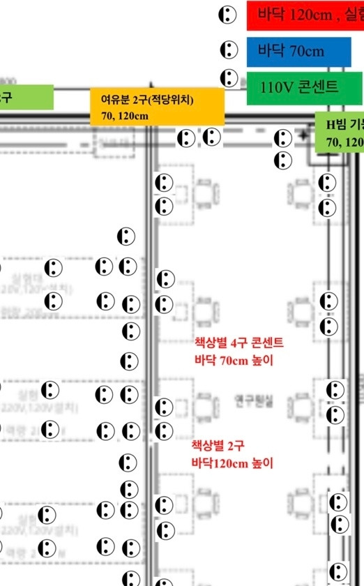 다시 이미지를 올렸다. 그게 아니란다. 2D상의 도면에서 설명으로 모든 것을 대신하면 서로 이해가 잘 되지 않으니 높이, 전압차이, 고전압장비 색깔별로 구별을 해달란다. 그럼 콘센트 모양 빼고 색깔별로 표시를 해 달라는 것인데, 시간이 너무 오래 걸리지 않나? 최대한 빨리 해보겠다고 했다.(음.. 퇴근하면 크리스마스 연휴니까, 30분이라도 일찍 퇴근하고 싶으니까) 아마 박사는 이게 왜 어렵지 했을 것이다. 처음 도면에서 테두리 색깔만 칠하면 되는데. 전화가 왔다. 선생님 그게 아니라, 처음에 준 도면에 보면 콘센트가 세 개 있는데 어느 것이 70m고, 110v, 220v 인지 구별하기 위한 표시를 해 달라는 말이었어요. 콘센트 세 개에 표시가 하나도 없는데요. 네? 표시가 없다고요? 아! 선생님, 혹시 테두리가 안 보이나요? 저 각각 모두 표시했는데요. 네?!! 아, 죄송해요. 안 보였어요.