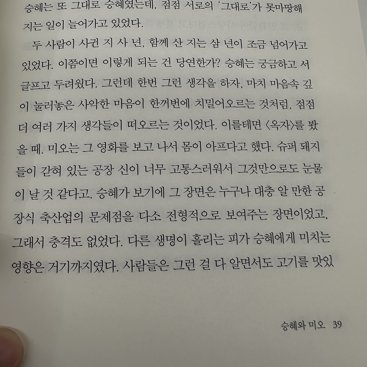 승혜는 이호의 그릇을 들여다보았다. 맑은 국물에 담긴 배추와 고기 무더기에서 김이 모락모락 올라오고 있었다. 미오는 왜 그렇게 고기를 못 견디게 싫어하게 되었을까. 승혜는 문득 생각하고는 자신이 그런 의문을 떠올렸다는 사실에 놀랐다. 얼마 전까지만 해도 그런 게 한 번도 궁금하지 않았다. 미오는 얼굴이 까만 대로, 너무나 좋아해서 목이 다 늘어난 티셔츠를 매일 입고 다니면 다니는 대로, 운동을 싫어하면 싫어하는 대로, 그냥 그대로 미오였고, 승혜는 또 그대로 승혜였는데, 점점 서로의 ‘그대로’가 못마땅해지는 일이 늘어나고 있었다.