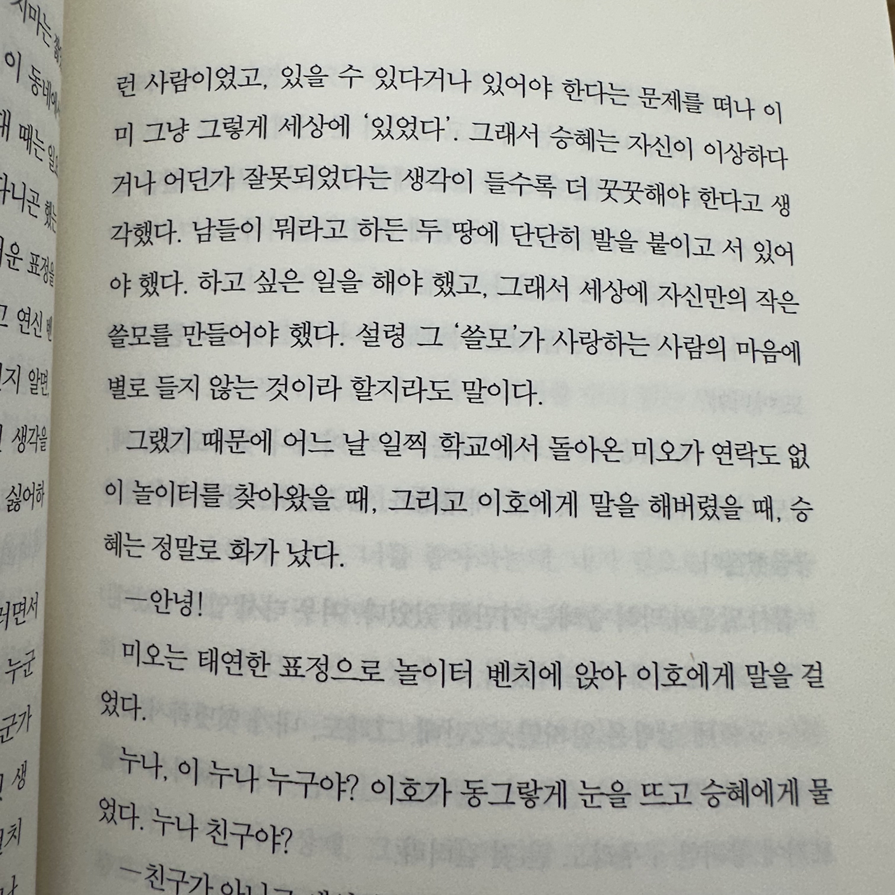 미오와 승혜의 분명한 차이가 보인다. 승혜는 그저 ‘있는 사람’으로 살아가는 인물이라면, 미오는 ‘거침없이 사는 사람’이다. 어느 날 일이 일찍 끝난 미오가 연락도 없이 놀이터로 찾아와 이호에게 말을 해버렸을 때, 승혜는 정말로 화가 났다.(49쪽 인용)