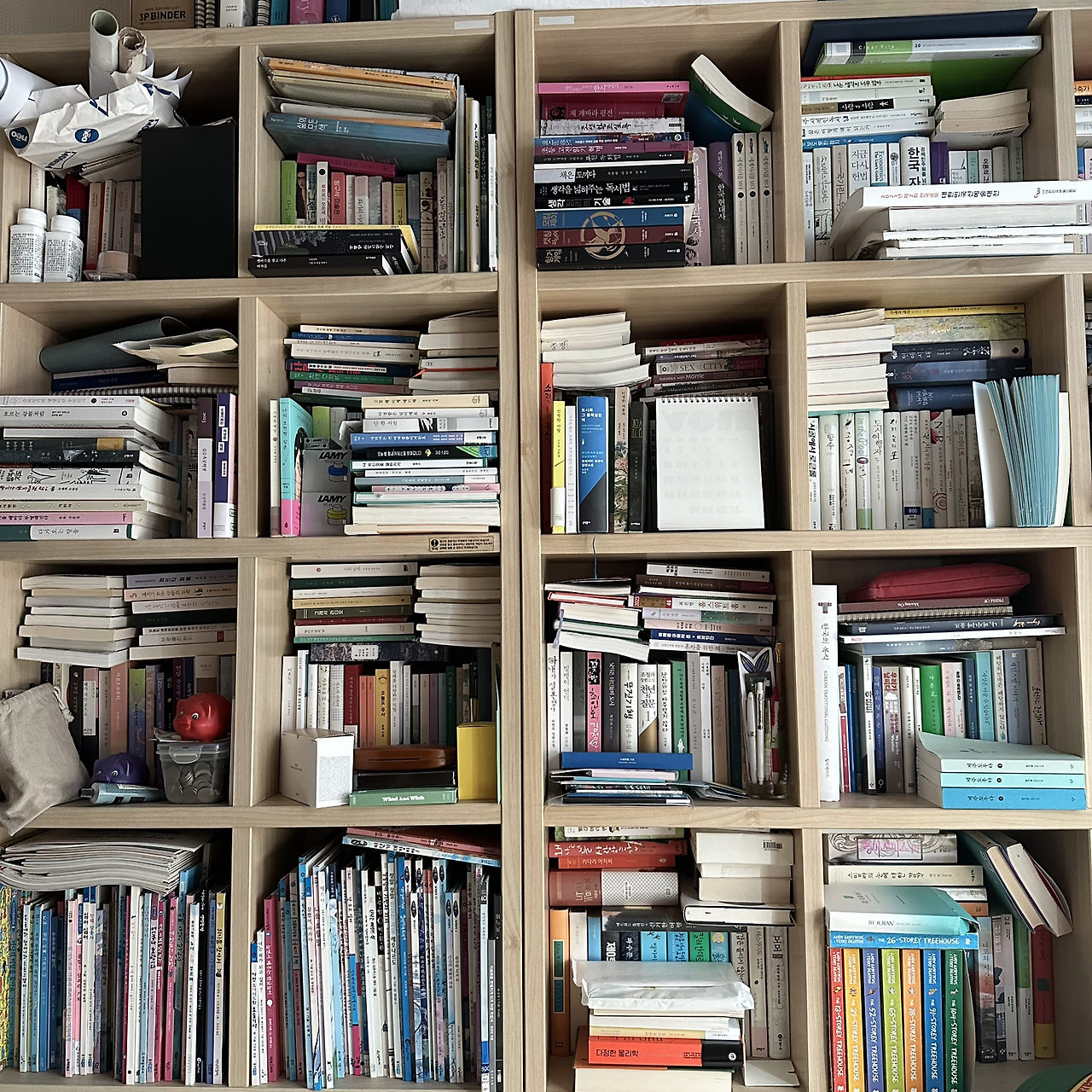 단편이 실린 곳을 보니 낯익은 간행물(?)도 있지만, 처음 보는 간행물도 있다. 이중 나는 ‘승혜와 미오’가 실린 테마소설집 <파인다이닝>이 친숙하다. 은행나무에서 펴낸 테마소설집 시리즈 중 <세상이 멈추면 나는 요가를 한다>, <사라지는 건 여자들뿐이거든요>, <호텔 프린스> 3권의 책을 읽었다. 그런 이유 때문인지 분명 <파인다이닝>을 구입했다고 생각했는데 아무리 찾아봐도 보이지 않는다. 이러다 갑자기 나올 수도 있다. 왜냐면 아래 그림이 내 책장 일부이기 때문이다. 읽은 책과 읽지 않은 책을 구별하기 위한 방법으로 배열해 놓아서 책 위치를 거의 바로 찾는데… 아직 안 나오는 것 보면 기억의 오류가 의심되지만 이러다 갑자기 나올까 봐 섣불리 사지 못하겠다. 이 책의 여러 이야기 중 ‘승혜와 미오’가 가장 끌린다.