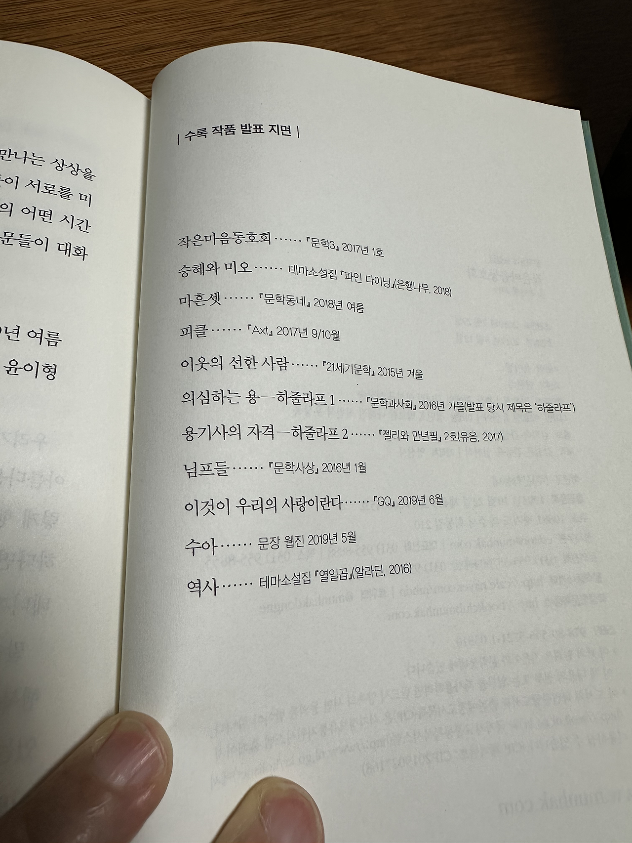 어떤 때는 한 권을 완독하고 다음 책으로 넘어가기도 하지만 여러 권을 동시에 읽기도 한다. 지금 3권을 같이 읽고 있다. 내가 참여하는 책모임 중에 소설가의 단편 소설 하나씩을 평일에 읽고 인증하는 모임이 있다. 지난달은 김금희 작가 작품이었고, 이번 달은 윤이형 작가 작품이다. 윤이형 작가 이름을 처음 듣는 듯했는데, 한 편씩 읽어보니 어디선가 읽은 것 같아 자꾸 단편이 실린 곳을 책 뒤편을 열어 확인한다.