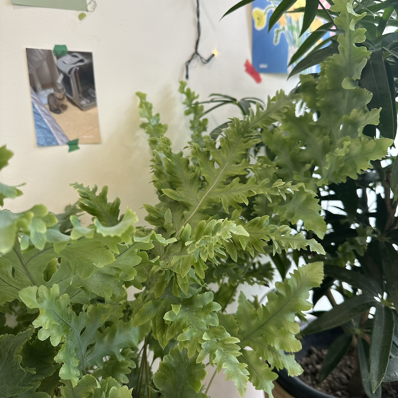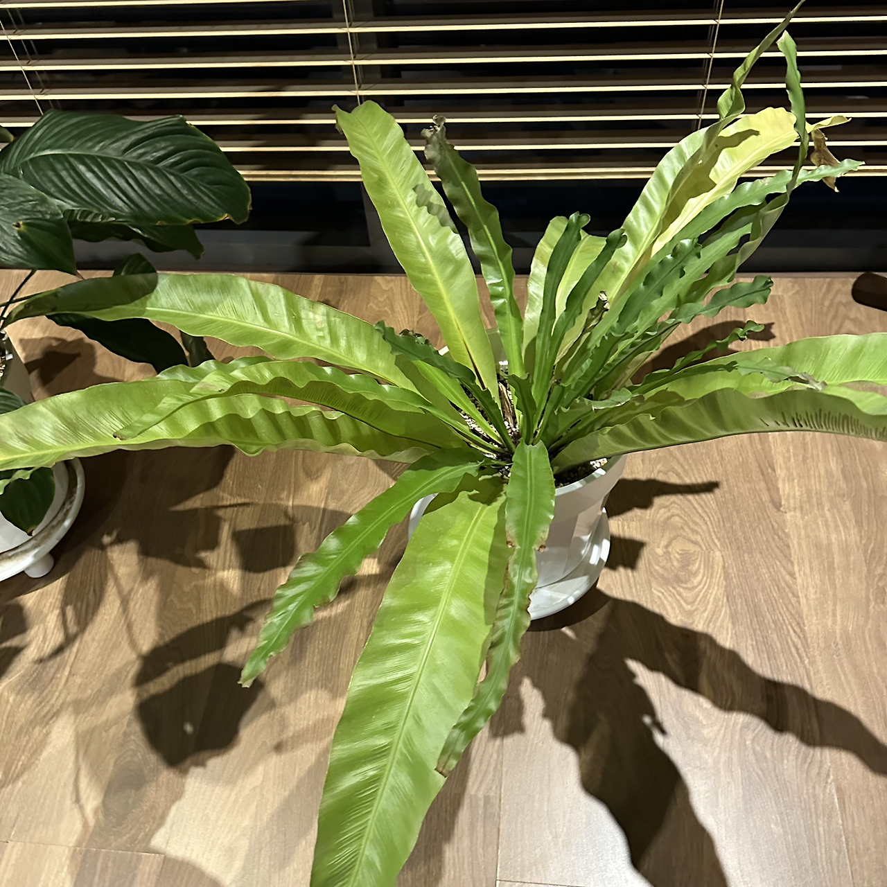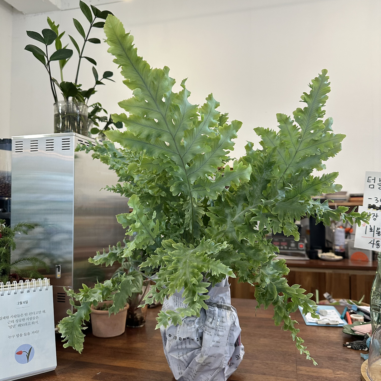 청소년을 위한 꽃 준비는 마쳤다. 졸업식 전날 직장 동료가 꽃집에 잠시 같이 가줄 수 있냐고 해서 아무 생각 없이 따라갔다. 청소년 꽃다발을 주문한 곳이 아닌 옆동네 꽃집이다. 이곳도 단골로 종종 들렀다. 온 동네 꽃집이 졸업시즌으로 꽃이 꽃집을 뒤덮고 있지만, 여기는 그 못지않게 식물도 꽤 있다. 큼지막한 식물은 언제나 눈길을 끈다. 큰 만큼 가격이 비싸서 섣불리 물어보기 힘들어서 그렇지, 작은 식물보다 큰 식물이 주는 위압만큼 집에 드려놓으면 한껏 편안함을 동시에 준다. 잔 주름의 웨이브가 드리워진 초록잎이 예쁜 식물이 눈에 들어왔다. 보자마자 고사리류인 걸 알아차렸다. 한동안 식물을 키워본 적 있는 나는, 의외로 고사리류에 반했다. 종류도 다양하지만 키우기 까다롭지 않고 번식력도 좋아서 오래 두고 보기 좋은 식물이다. 이 식물의 정확한 이름은 모르지만 고사리류임은 틀림없다.