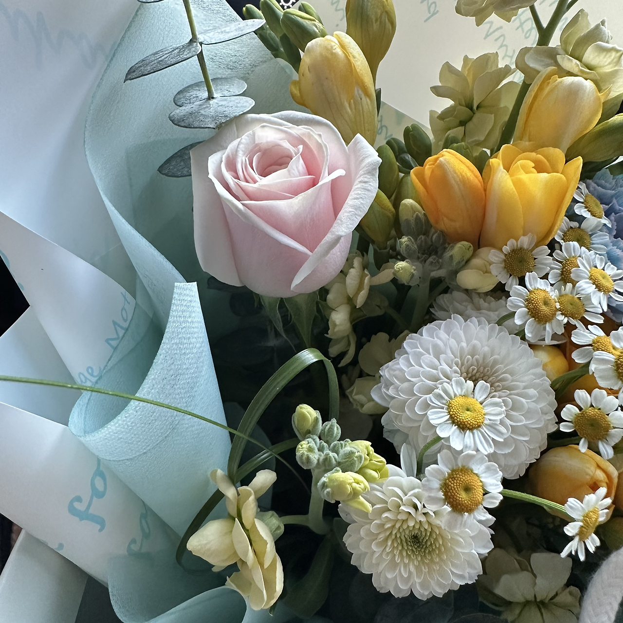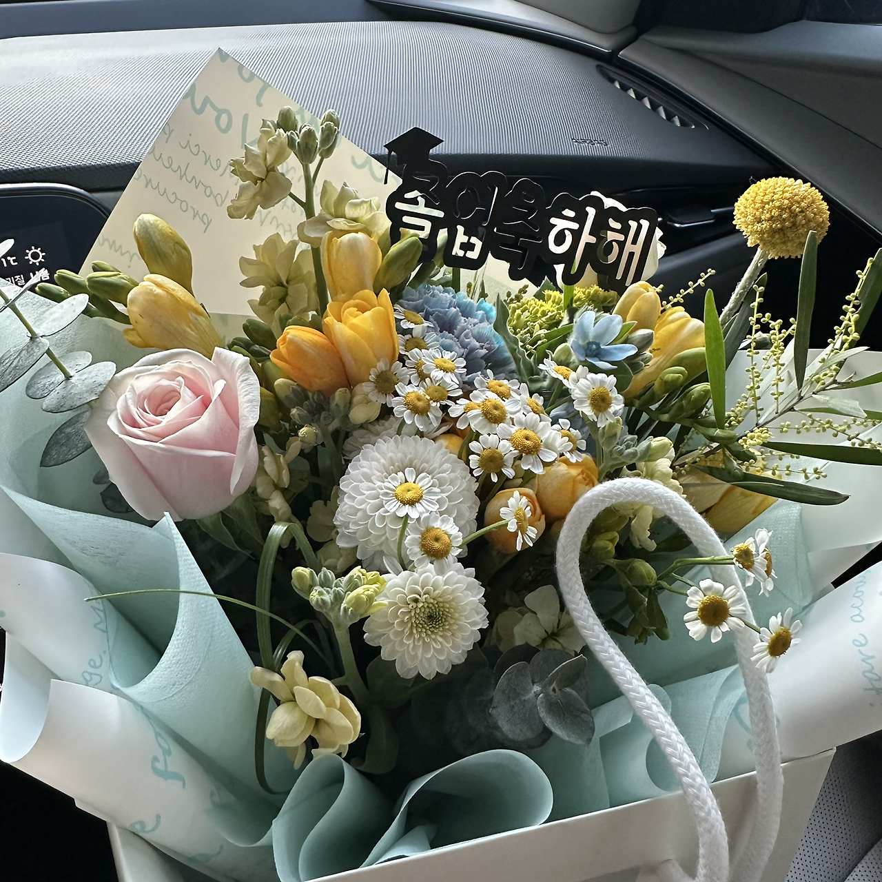 쉼표 못지않게 마침표를 찍는 사람들도 있다. 연말을 기점으로 퇴사를 결심한 사람들도 있을 테고 졸업을 앞두고 있는 학생들도 있다. 우리 집 청소년도 다음 학년을 위해 졸업식을 치르게 되었다. 코로나 이후로 처음 맞이하는 대면(비대면과 대면을 구별 짓는 시대를 살 줄이야) 졸업식이다. 초등학교 졸업식은 코로나로 부모 참석이 되지 않아 갈 생각을 하지 않았다. 끝나고 나서 데리러 갈 때 꽃다발 대신 풍선을 줬지만 이제는 졸업식 참석이 가능하니 꽃을 준비했다. 이번 주 졸업식이 많아 꽃집에서는 일찌감치 지난주 금요일에 꽃 주문을 마감했다. 다행히 졸업식에 들고 갈 꽃다발을 주문했다. 마감을 임박하고 주문한 나는 사장님께서 원하는 스타일이 있냐고 물었지만, 마음대로 해달라고 했다. 사장님 솜씨를 믿으니까. 아니나 다를까 노란색과 흰색이 조화로워 마음에 든다.