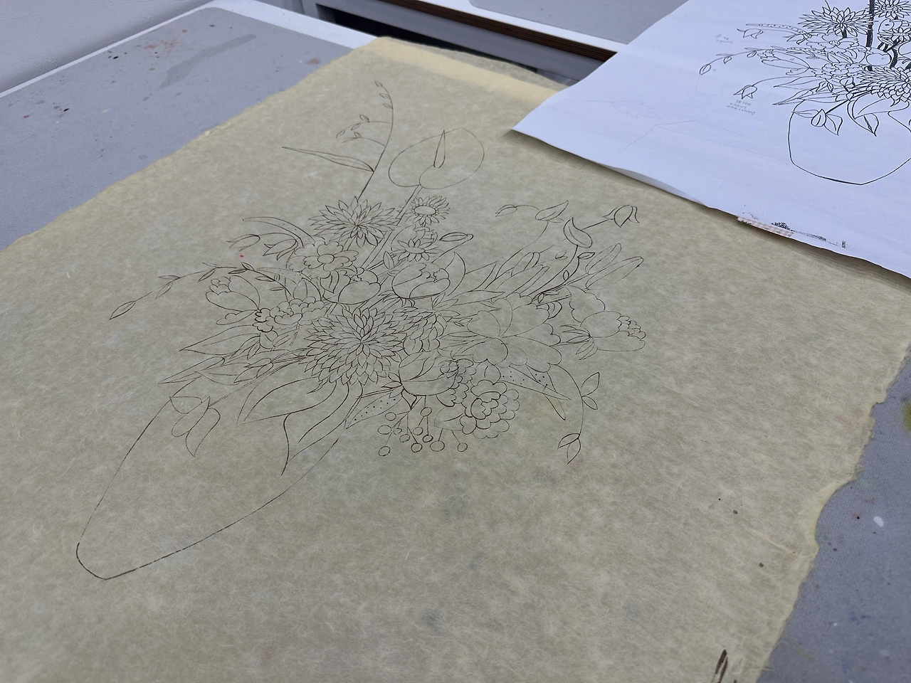 선생님께 전체적인 과정을 물어본다. 처음 해보는 과정이기 때문에 트레이싱지(기름종이)에 연필로 밑그림을 그려온다. 선생님이 검토를 해 주신다. 꽃을 단순화해서 그릴 수 있도록 선생님께서 요구하는 수정 사항을 거친다. 네임펜으로 다시 밑그림을 딴다. 적당한 크기로 그림을 맞춘다. 한지에 옮긴다. 색채를 한다. 몇 과정 되지 않아 보이지만, 막상 하게 되면 2달은 훌쩍 넘는 시간이다. 그림 그리는 과정을 가끔 인스타그램에 올리고 완성작을 올린다. 지인들의 가장 흔한 질문은 몇 시간 걸렸느냐는 말이다. 시간으로 환산한다면 20시간에서 40시간까지 걸린 작품도 있다.