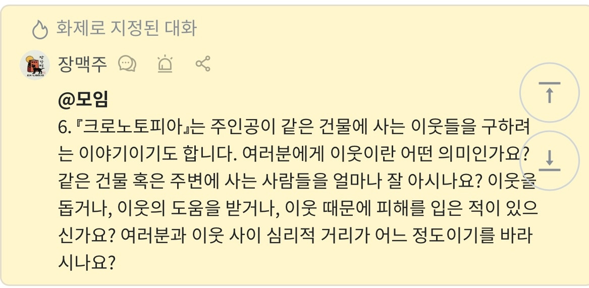 <크로노토피아>로 그믐 책모임(온라인)을 하고 있다. <크로노토피아>는 9살 소년이 엘리베이터를 타고 과거로 돌아가 현재 상황을 바꾼다거나, 이웃을 구한다거나 하는 이야기다. 모임 지기인 ‘장맥주’ 님께서 모임원에게 남기는 질문 중 이웃에 관한 말이 있다.